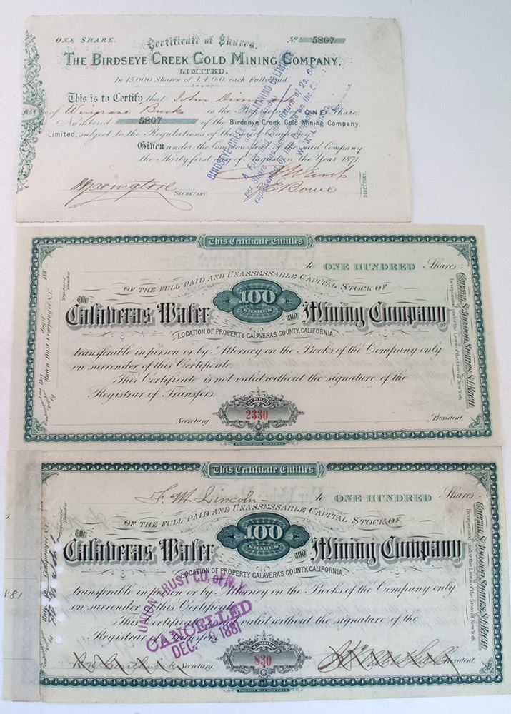 1) Hydraulic Mining Stocks of California-Calaveras Water & Mining Co. Stocks,1881. 2). Also includes The Birdseye Creek Gold Mining Company, signed and dated 1871.