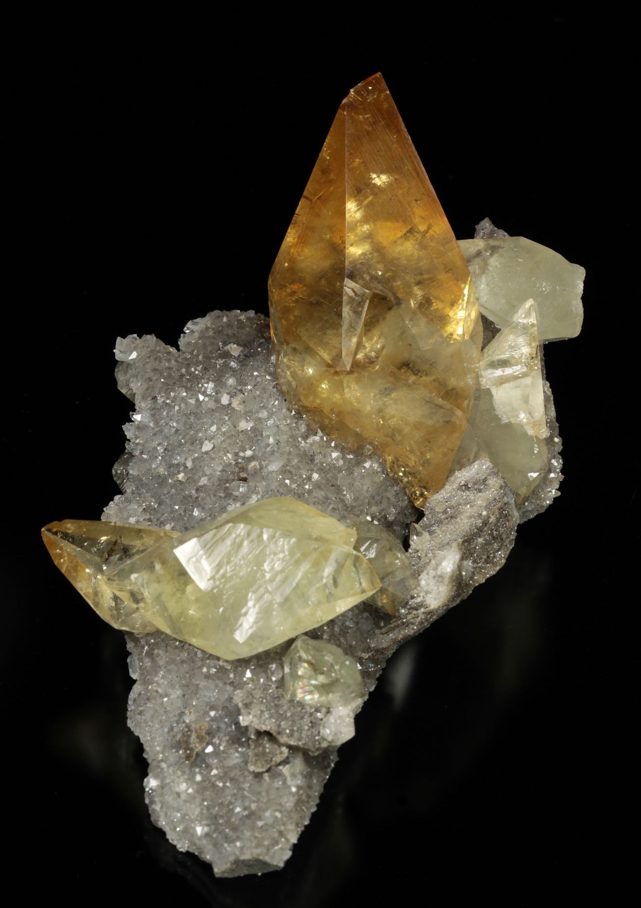 First opened in the 1970s, the Elmwood Mine (the Elmwood-Gordonsville-Cumberland mining complex) has produced some of the world's finest calcite crystals, many of which are twinned. Over the years, miners referred to the clear gemmy calcites observed on this specimen as "jewels". This specimen is from a pocket discovered in 2014. The specimen features one primary calcite crystal exhibiting the popular, strong amber-yellow color and several other calcite crystals featuring a lighter yellow color. The calcite crystals on this specimen are in good condition and have glassy luster. This is a superior quality calcite specimen from a classic American locale. Dimensions (cm): 5.5 H x 11 W x 6.5 D. Location: Elmwood mine, Carthage, Smith Co., Tennessee, USA City: Carthage State: Tennessee Date: