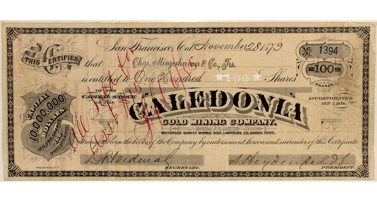 Signed by President S. Heydenfeldt. Solomon Heydenfeldt (1816–1890) was the first Jewish justice of the Supreme Court of California in the United States. He was elected by direct vote of the people and served from 1852 to 1857. His opinion in Irwin v . Phillips established the doctrine of prior appropriation in western water law jurisprudence. Number 1394 for 100 shares issued in San Francisco on November 28, 1879.City: Whitewood Quartz Mining DCounty: LawrenceState: SDDate: