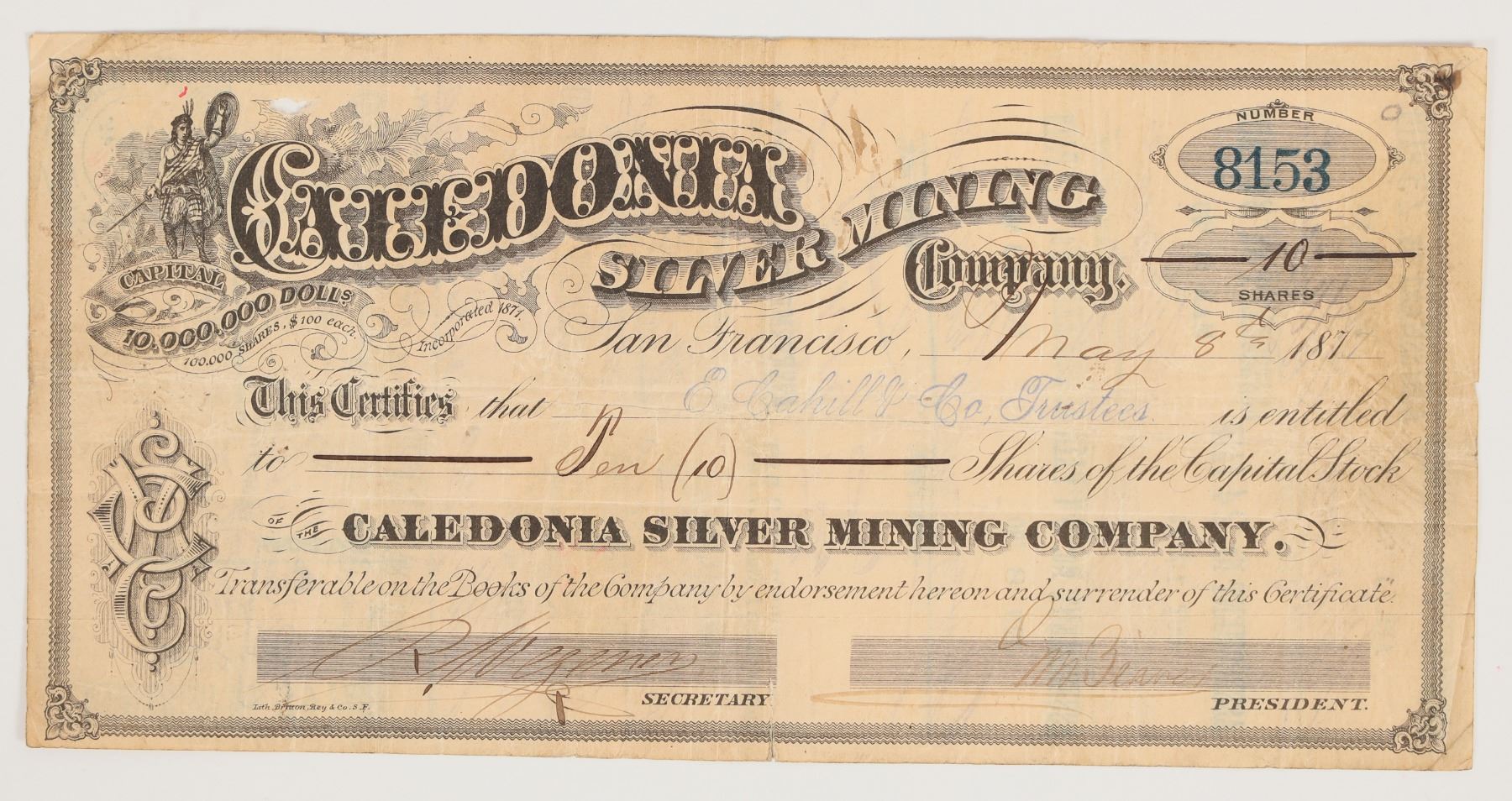 Inc. 1871. No. 8153, issued for 10 shares in 1877. Signed by the president and secretary. Not cancelled. Many folds and creases, pinholes, soiling. The Caledonia Mine was located south of the Overman Pit approx. 0.5 mile southwest of Gold Hill. It was formed from a consolidation of seven claims in 1861 and was 2,188 ft. on the Comstock Lode. In the 1860s, John Mackay served as one of its superintendents. [Ref: Ansari]