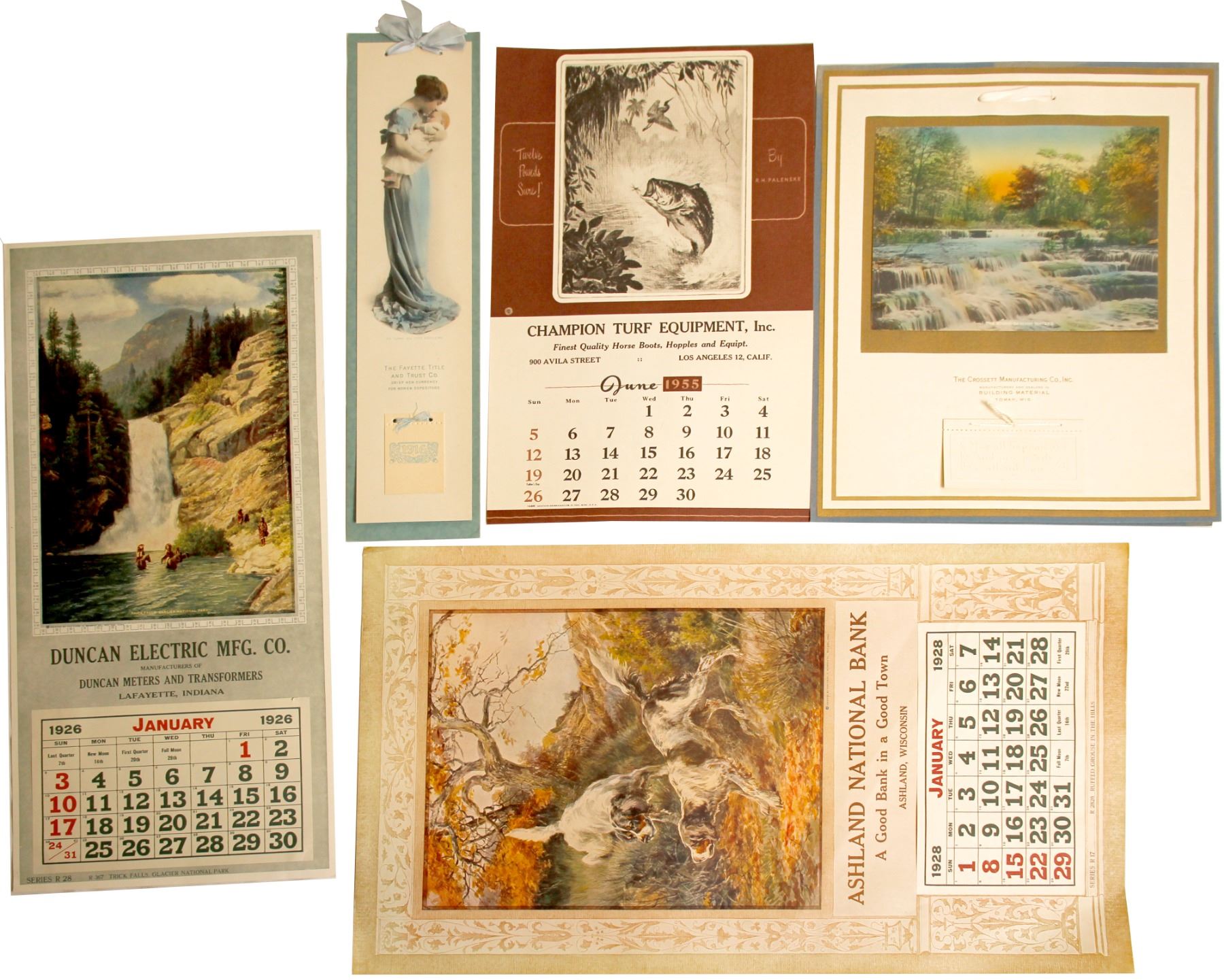 Collection of 6 calendars ranging from 1916 to 1928. From Wisconsin, Lafayette, Indiana. Beautiful scenes of waterfalls, woman & child, Native Americans on horseback under waterfalls, hunting dogs. Very nice condition. Ready for frames. State: Wisconsin City: Ashland Date: Early 20th Century HWAC# 84439