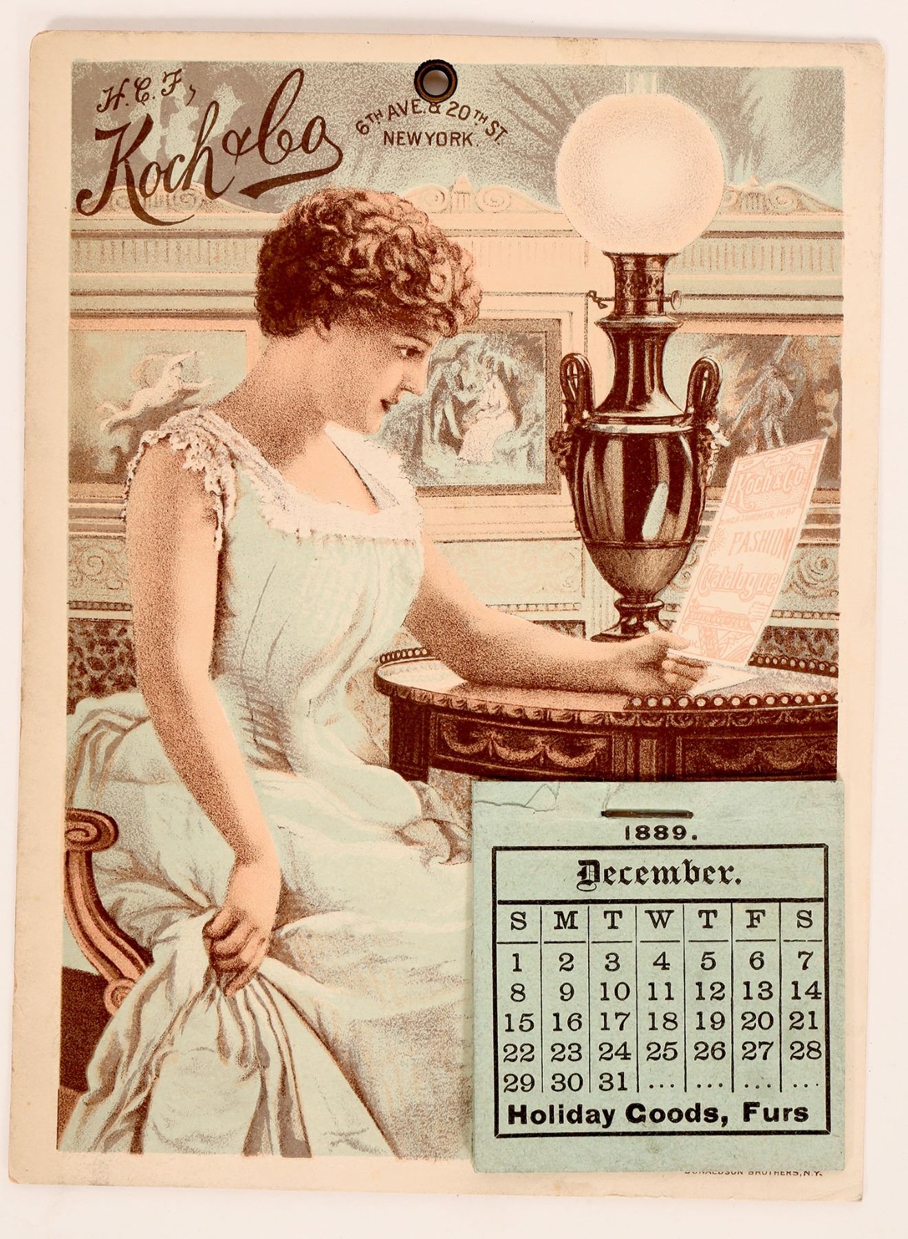 Rare calendar (1889) trade card from H. C. F. Koch & Co., 6th Avenue & 20th Street in New York. 4 1/2 x 6 inches. [