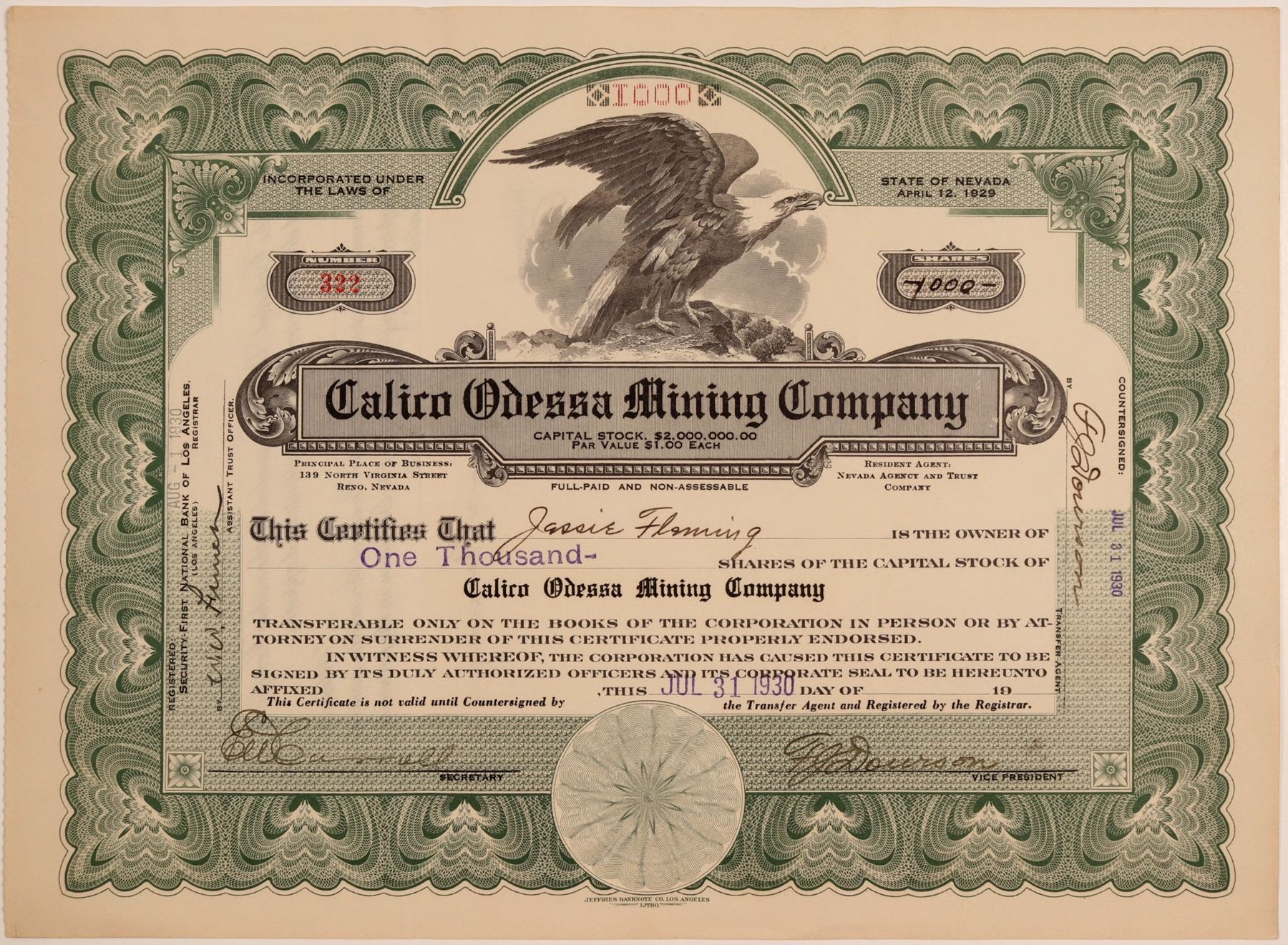 Inc. in Nevada, 1929. No. 322, issued for 1,000 shares to J. Fleming in 1930. Signed by vice president Dawson and the secretary (Carroll). Not cancelled. Green border, black print, and eagle vignette. Folds, toning. 9 x 12" This company's group of mines consisted of a number of former producing properties known as the Baltic, Bismark, Garfield, Odessa and Thunderer groups in the Calico Mining District, 5 miles northwest of Yermo, a station on the Union Pacific Railroad. (State Mineralogist, 1930) City: Calico, San Bernardino County State: California Date: 1930
