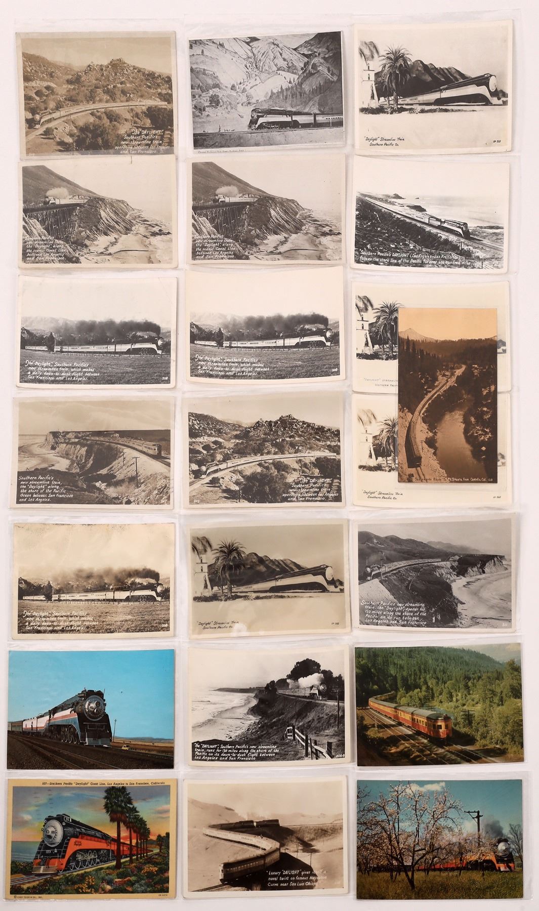 Lot of 22. There are four color photos in the collection, one is of the American Freedom Train. Mostly birds eye views w/ a few ground level views of the popular coastal flyer. Postmarks: SF 1944, L.A. 1937, Salinas 1937, Weed 1939, Hugo Ore 1912.