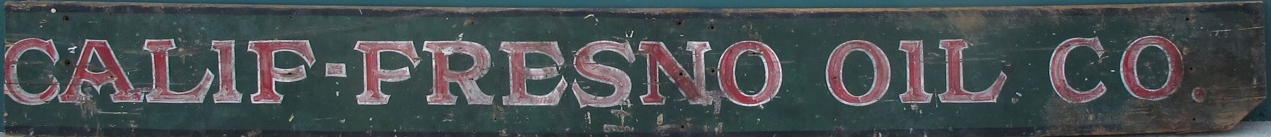 Calif – Fresno Oil Company wood sign. The 112" long 11.5" wide, 1" thick. Original wood board, hand-painted sign with mounting holes throughout. Trimmed in later years at far left end. Black border forest green paint background red letters with silver outlines. Look up history company. (Daniel Manassellian sign collection of Fresno).