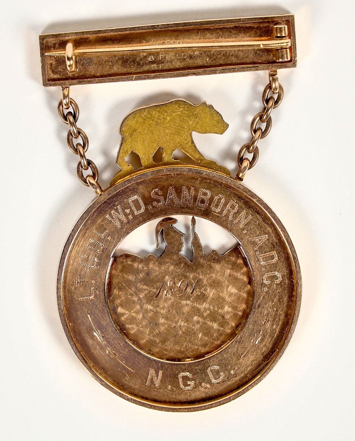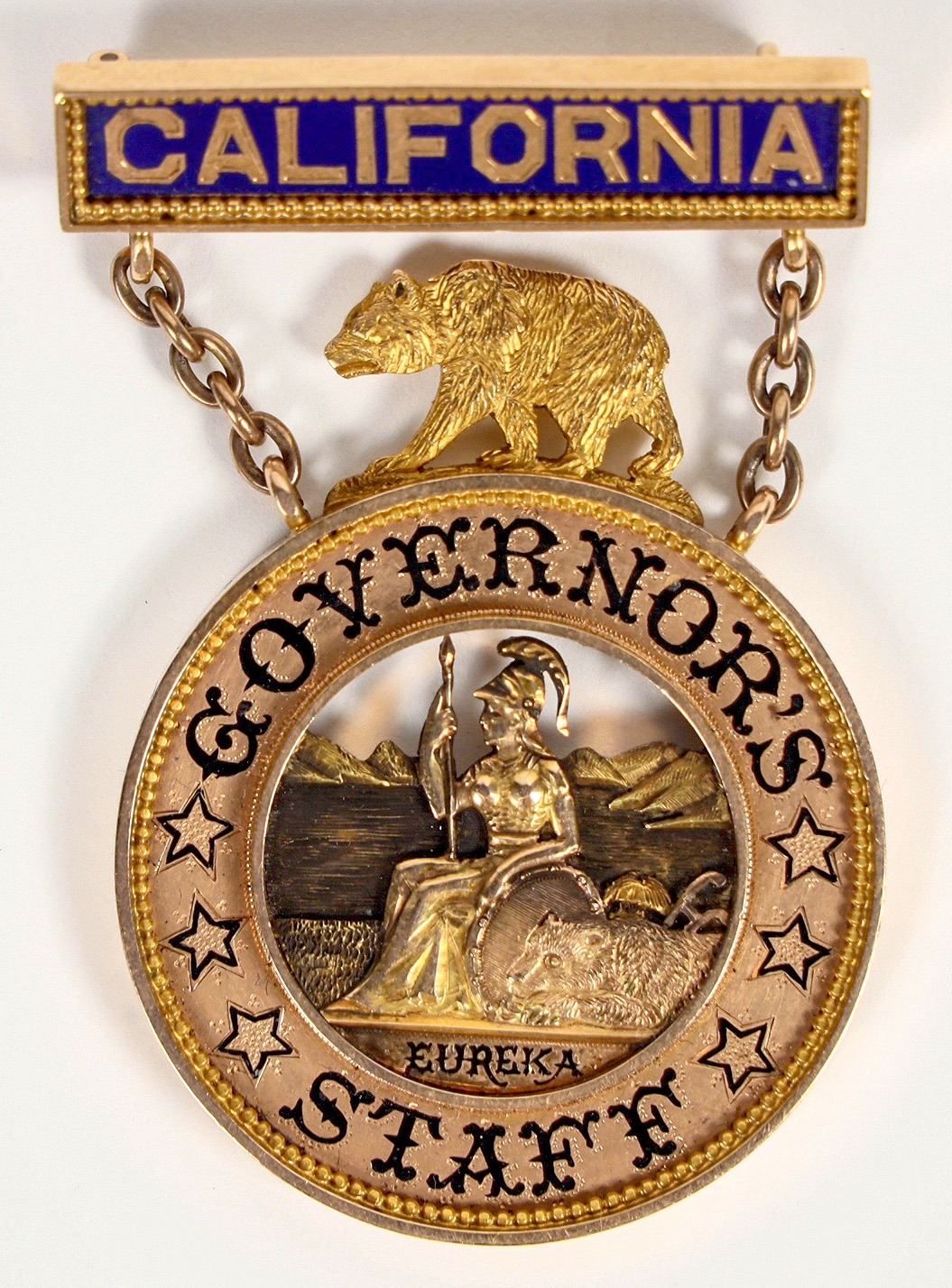 14kt gold lapel badge "Lt Col. W. D. Sanborn, ADC / N.G.C." 2" long, 1.5" diameter. "California/ Governor's/ Staff" on the front, blue enamel outlines. 23.9 grams. (roughly 15g Au, 1/2oz)