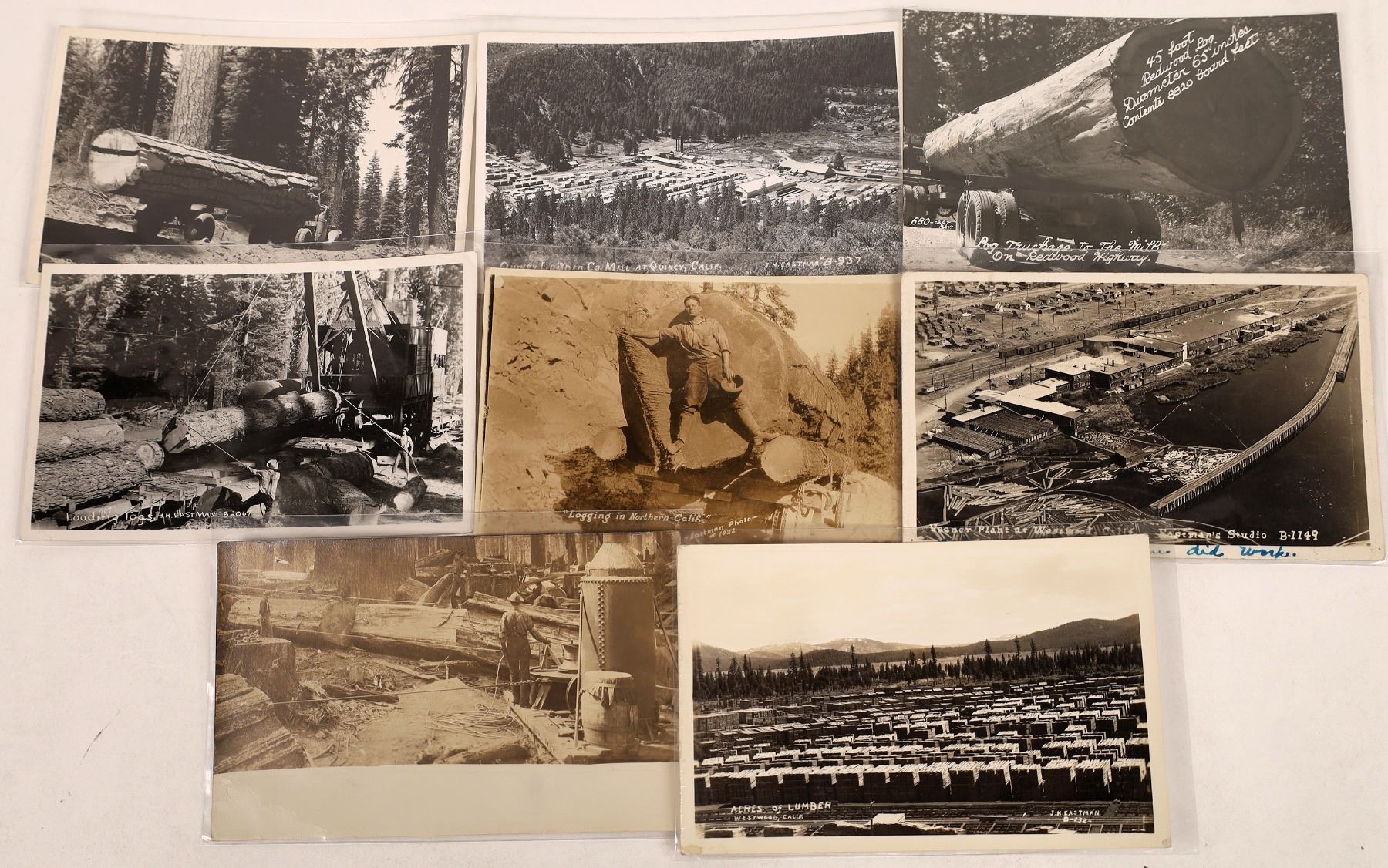 Lot of 8. Redwood logging RPC’s, white borders. Ground and aerial views of mills, camps and loggers. All in protective covers. J.H. Eastman born in White CLiud, MI. And moved to NOthern Clair in 1886 to Sisson ( Now Mt. Shasta) where he launched his career as a view photographer and later became partner in Shasta View and later Eastman & Co.