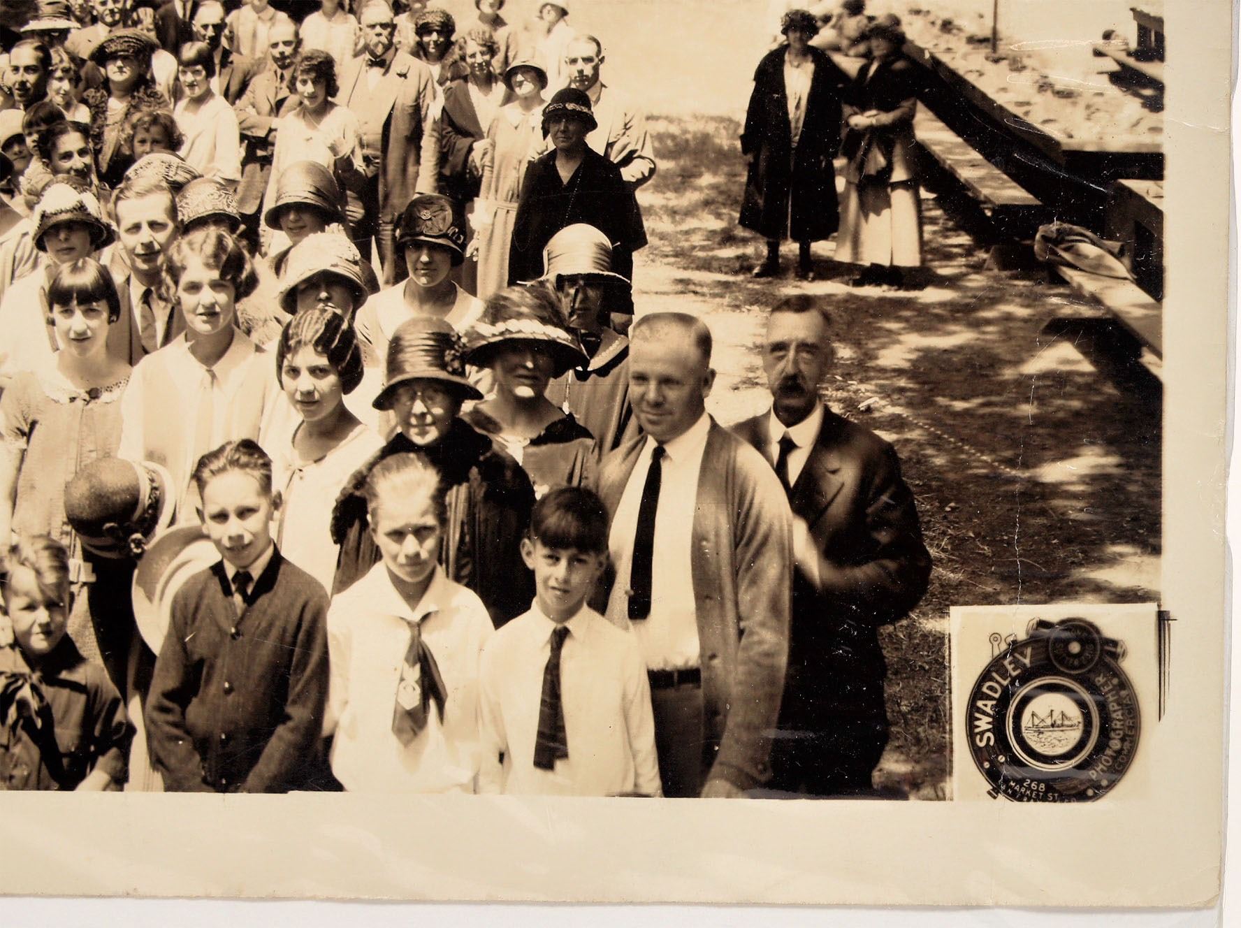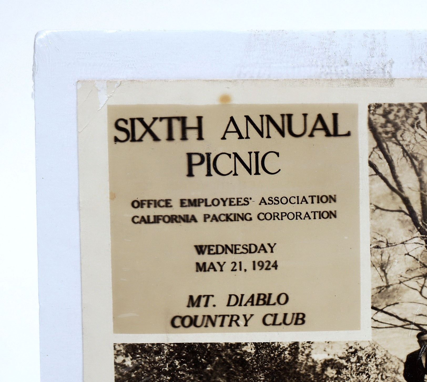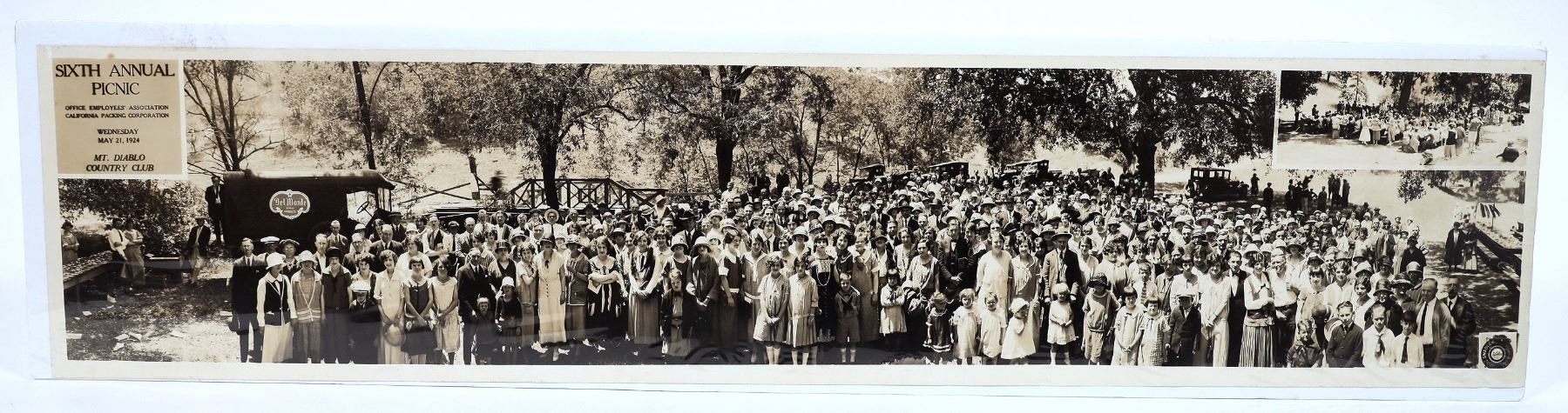 California Packing Corporation (also known by Del Monte or CalPak) panorama photograph, with description upper left corner, "Sixth Annual Picnic/Office Employees' Association/California Packing Corporation/Wednesday/May 21, 1924/Mt. Diablo/Country Club" in Walnut Creek, Calif. Wide shot includes hundreds of men, women and children in period dress, with a Del Monte van and numerous other vintage vehicles in the background; and a smaller shot of an apparent awards ceremony upper right. Photographer insignia lower right reads, "(Wesley) Swadley, Photographer, Commercial, 268 Market St., San Francisco." 36" x 8". California Packing Corporation was a major canner and dried fruit processor. Founded in 1916, the company dominated the industry through the 1980s and still exists today.