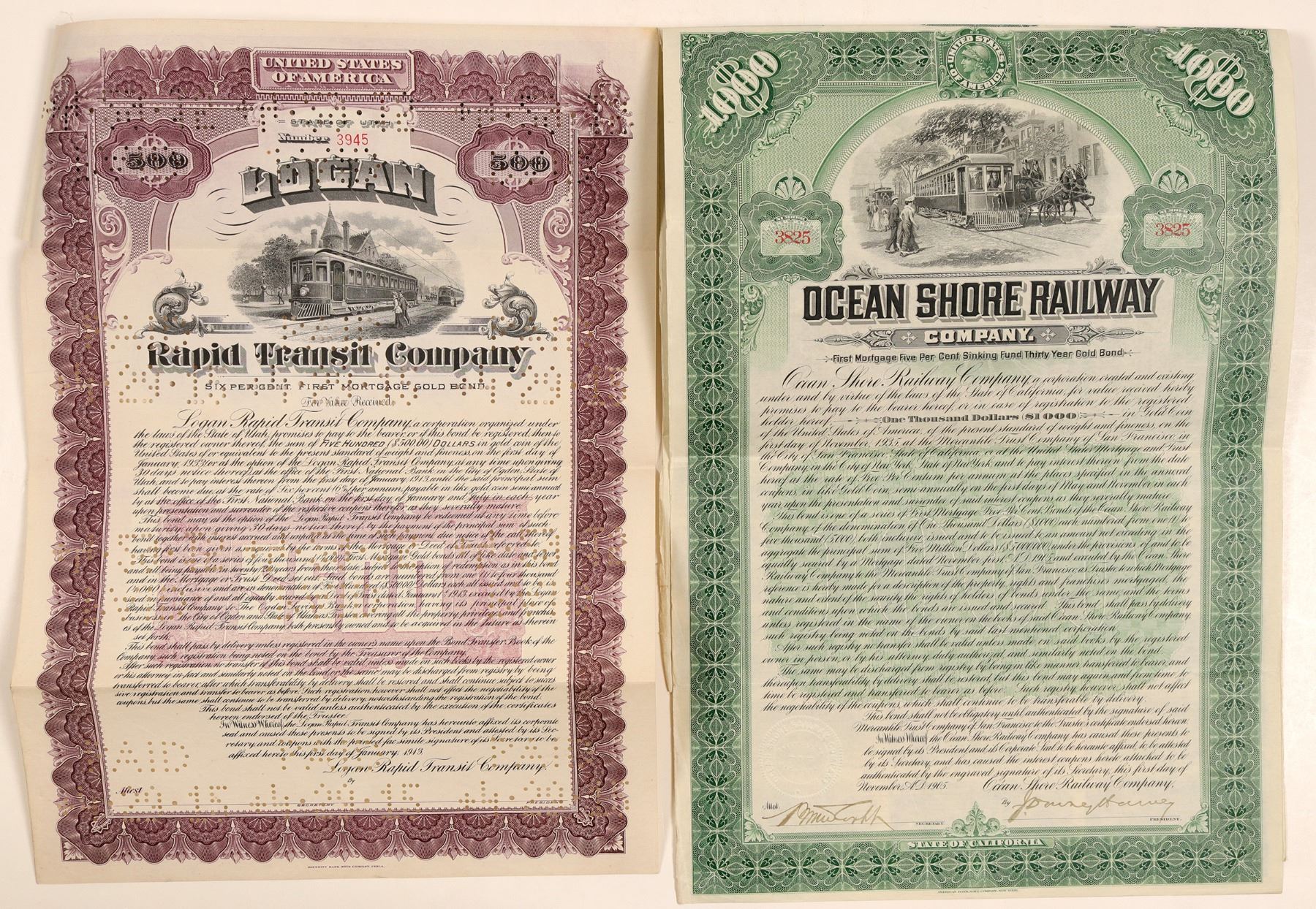 2. Ocean Shore Railway Co. incorp May 1905 California. # 3825, I/U, $1000 5% 30 yr First Mortgage Sinking Fund gold bearer bond. Issued Nov. 1, 1905 signed secretary and president. GREEN, embossed seal, vignette top electric street car w/ horse carriage on right and people on left. $1000 in white/green outline in green underprint. Coupons # 8-60 attached each w.vignette of female facing left. EF cond. American Bank Note Co printer. Ken Prag Collection