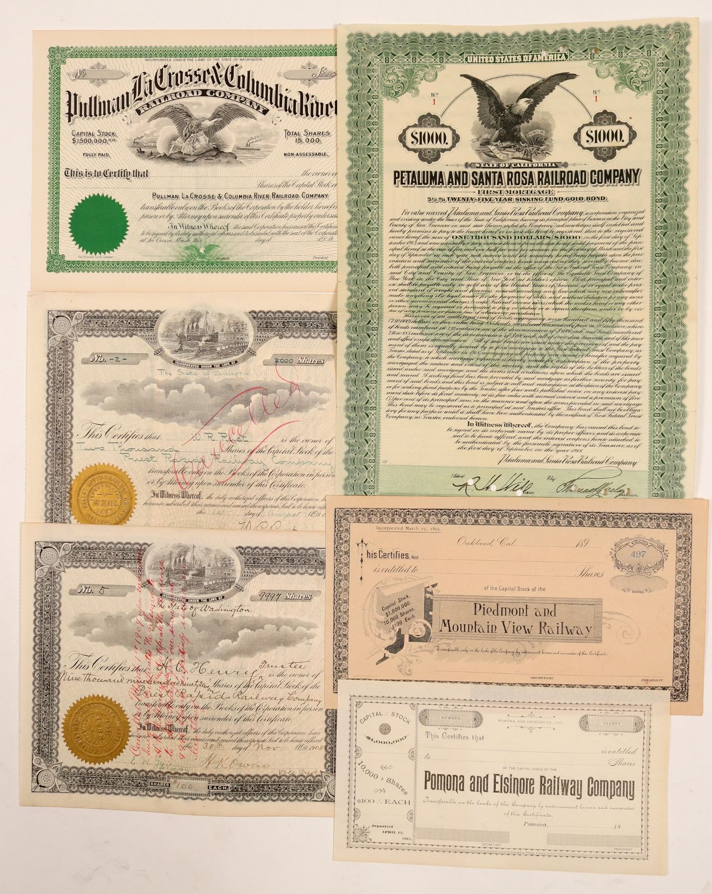2. Three unissued certificates: Pomona and Elsinore Railway Co. incorp 1887 Calif. $100 par, no vignette, BLACK, w/receipt. Champion Print printer. Pullman Lacrosse & Columbia River Railroad Co. Incorp Washington, GREEN, vignette eagle spread wing w.train on left and ship on right. The Spokane Litho Co printer. Piedmont and Mountain View Railway, incorp 1895 Calif. #497, BLACK, no vignette, w/receipt. M.S. Crocker Co. printer.