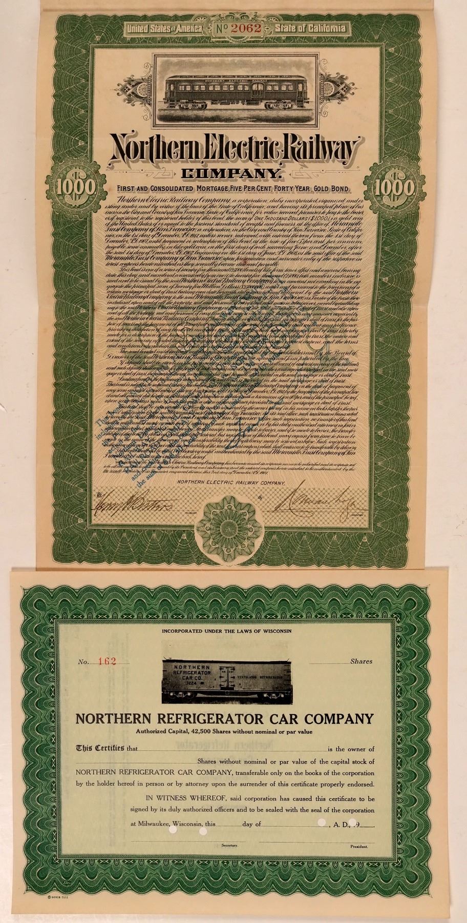 Two certificates. 1. Northern Refrigerator Car Co. incorp 1924 Wisconsin. #162, U/C, no par value, dateline 19__, green, vignette refrigerator car. Goes printer. AU