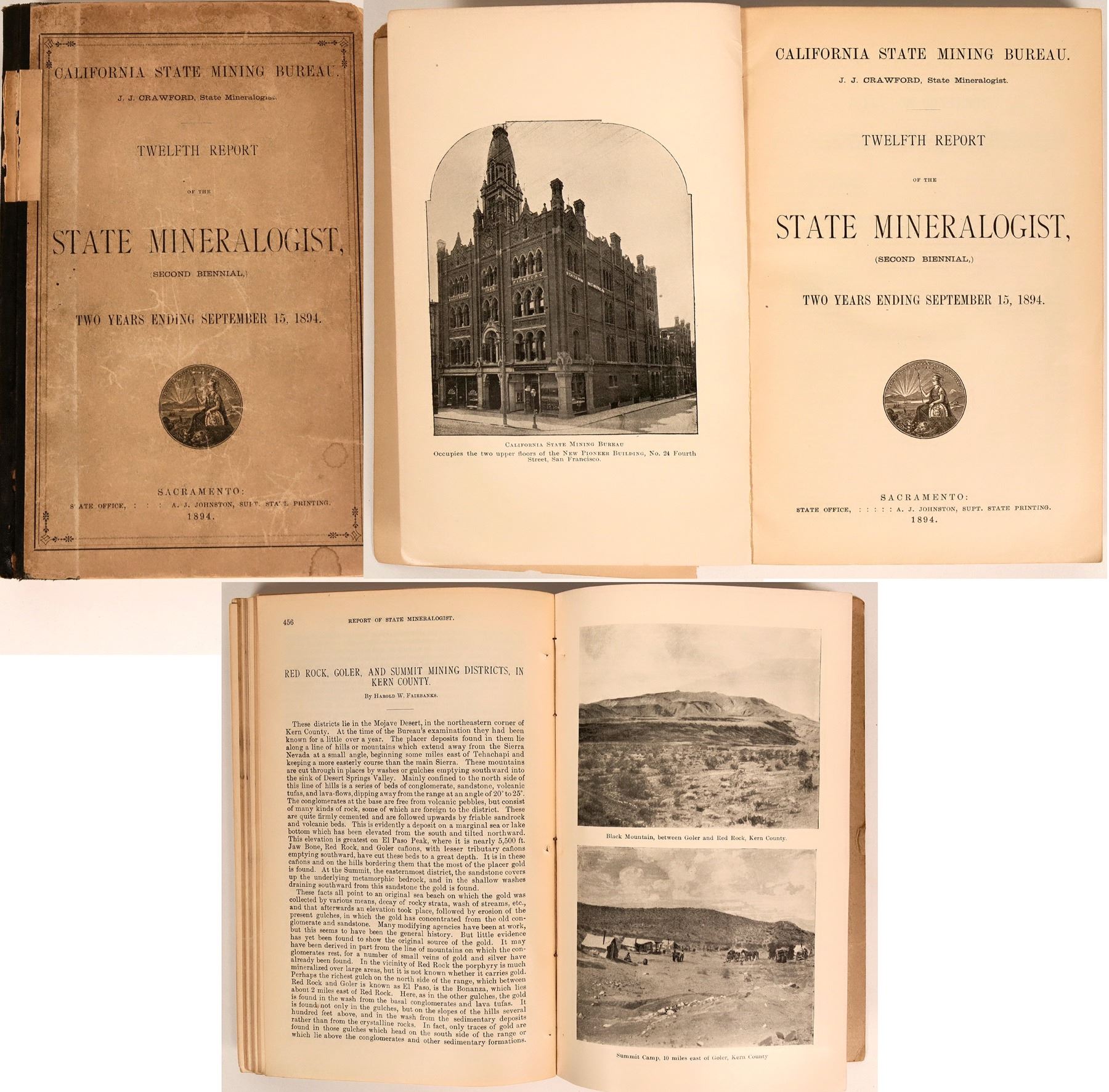 California State Mining Bureau J.J. Crawford, State Mineralogist, 12th Report, Second Biennial, Two years ending September 15, 1894. Sacramento: State Office A.J. Johnston, Supt. State Printing. Hard bound. 6" x 9" 541 pages, 94 illustrations, 4 fold out maps. All pages present. Condition consistent with age. Original printing, invaluable mining reference work.