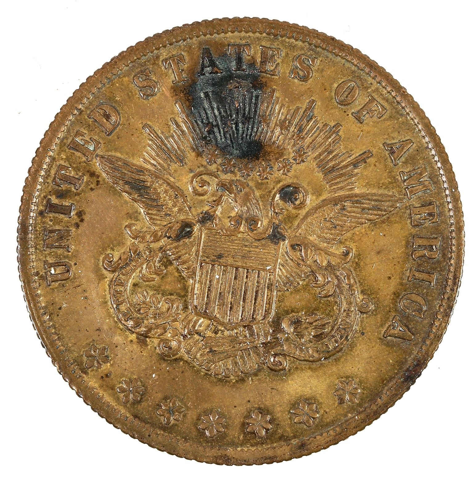 Bronze token used as a $20 California gaming counter. Obv.: California / (American Flag) / Counter. Rev.: United States of America / eagle with shield) / (seven stars). Bronze, rd., 33mm. Overall EF-AU, some residue above the eagle's head.