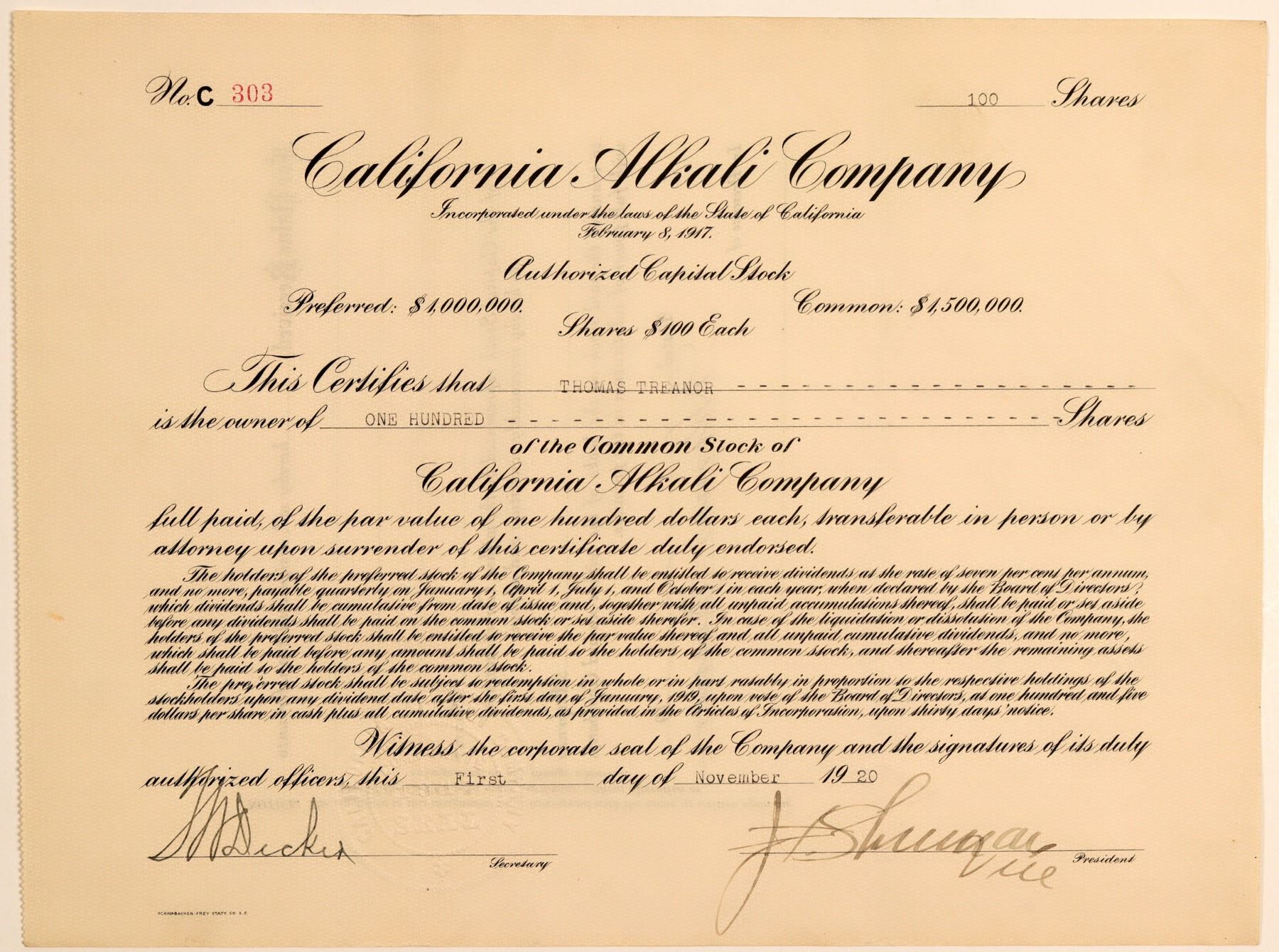 Extremely rare. This company mined soda ash at Cartago, now a ghost town at Owens Lake in Inyo County. They operated 1917-1932, eventually becoming the Inyo Chemical Company (in 1924). They obtained their CO2 from vertical coke fired lime kilns using dolomite from the Western Inyo Mountains, or limestone from Cerro Gordo. Inc. in 1917. No. 303, issued for Thomas Treanor in 1920. Signed by the vice president (Sherman?) and secretary Dickens. Not cancelled. Plain design with black print. 8.5 x 11.5" Folds, pinholes, some toning.