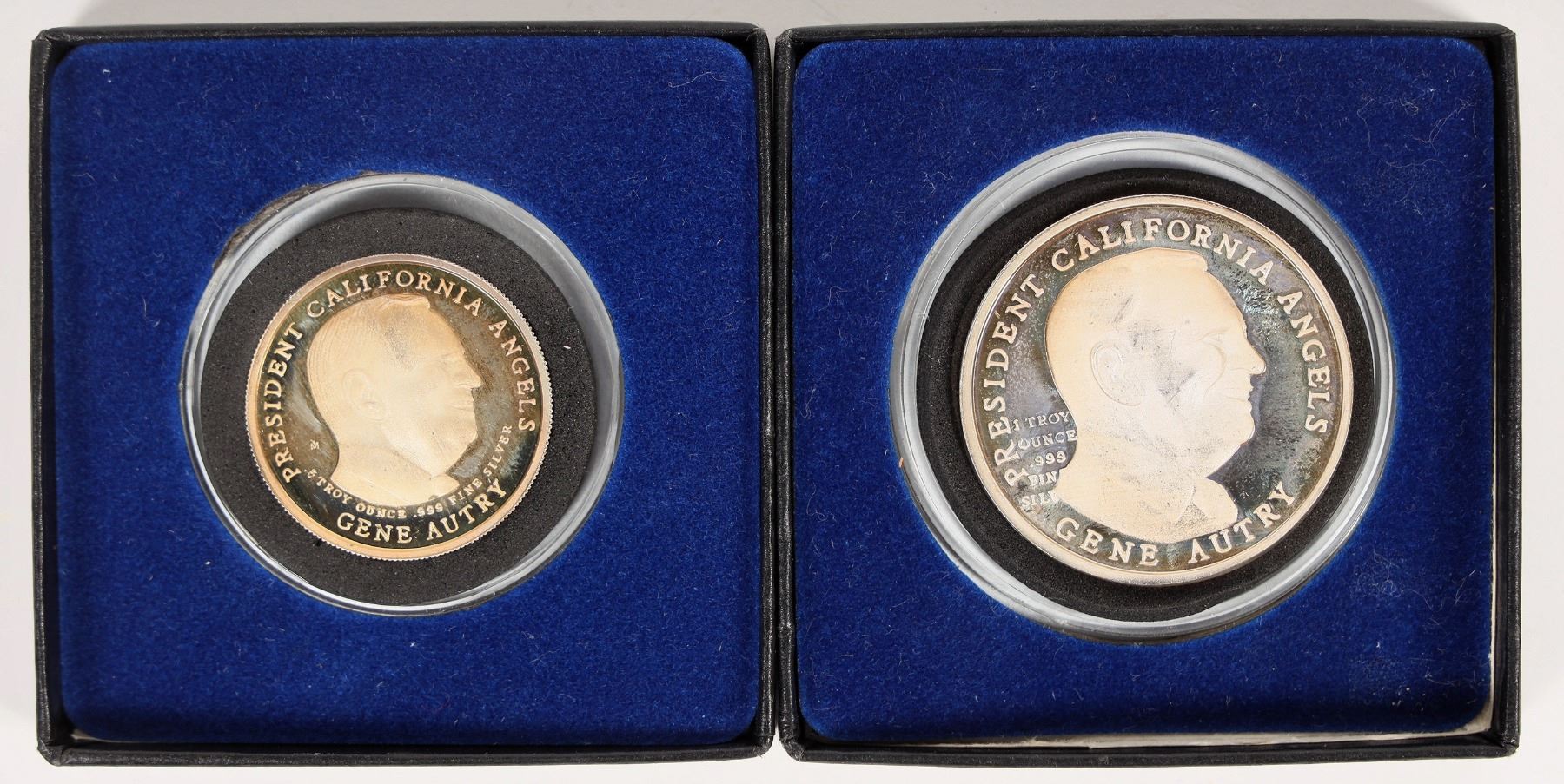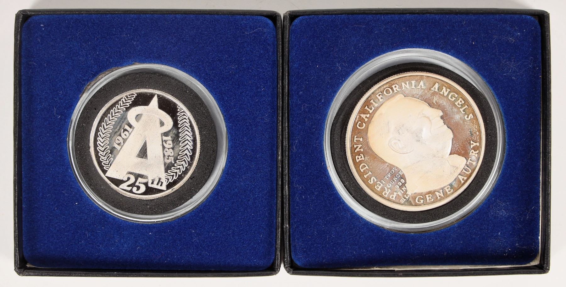 Two one troy ounce silver rounds made by the Yorkshire Mint to commemorate the 25th Anniversary of the California Angels baseball team (1961-1985). The A with the halo on one side, President Gene Autry on the other. In original boxes and hard shell plastic cases.
