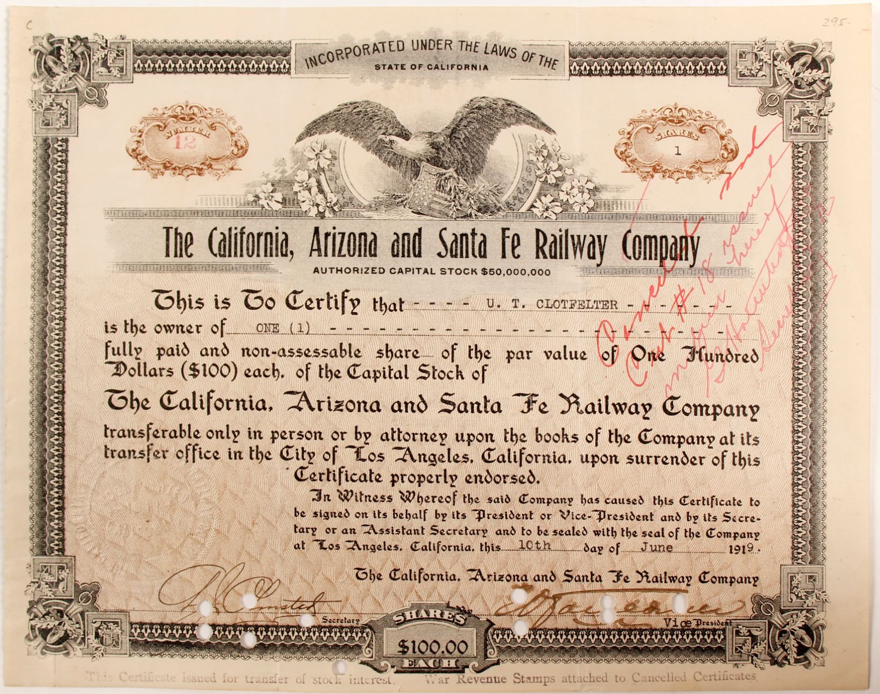 I/C #12 UT Clotfelter 1 share 1919 signed by VP Illegible. "The California, Arizona and Santa Fe Railway was a non-operating subsidiary (paper railroad) of Atchison, Topeka and Santa Fe Railway (ATSF). It was incorporated in 1911, and was merged into the ATSF in 1963. California, Arizona and Santa Fe would ultimately be absorbed by Burlington Northern Santa Fe Railway." from wikipedia. Prag Collection. State: City: Date: 1919 HWAC# 83470