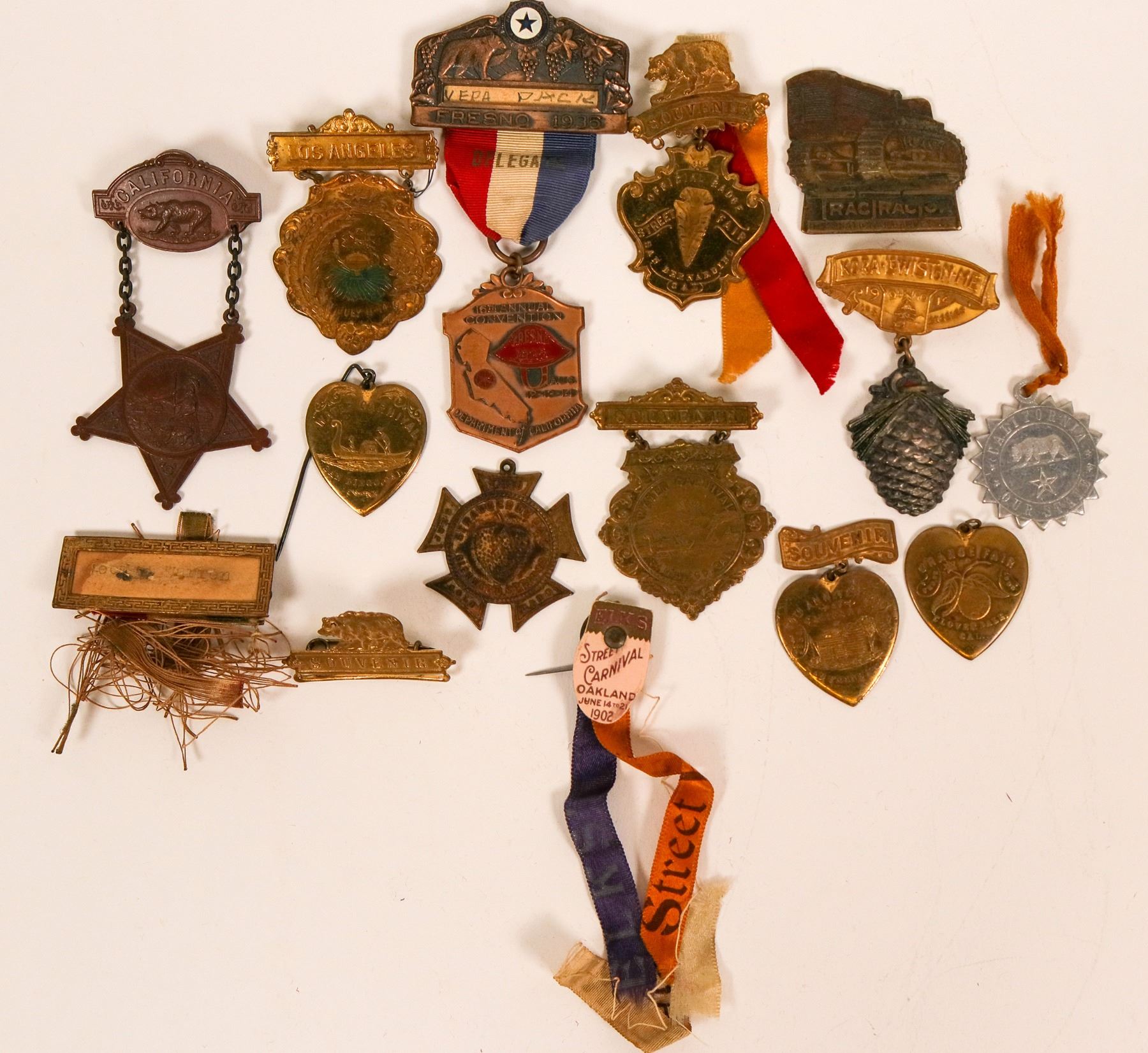 Group of 16 California themed badges, pins and ribbons from the Fresno area. Varying condition.