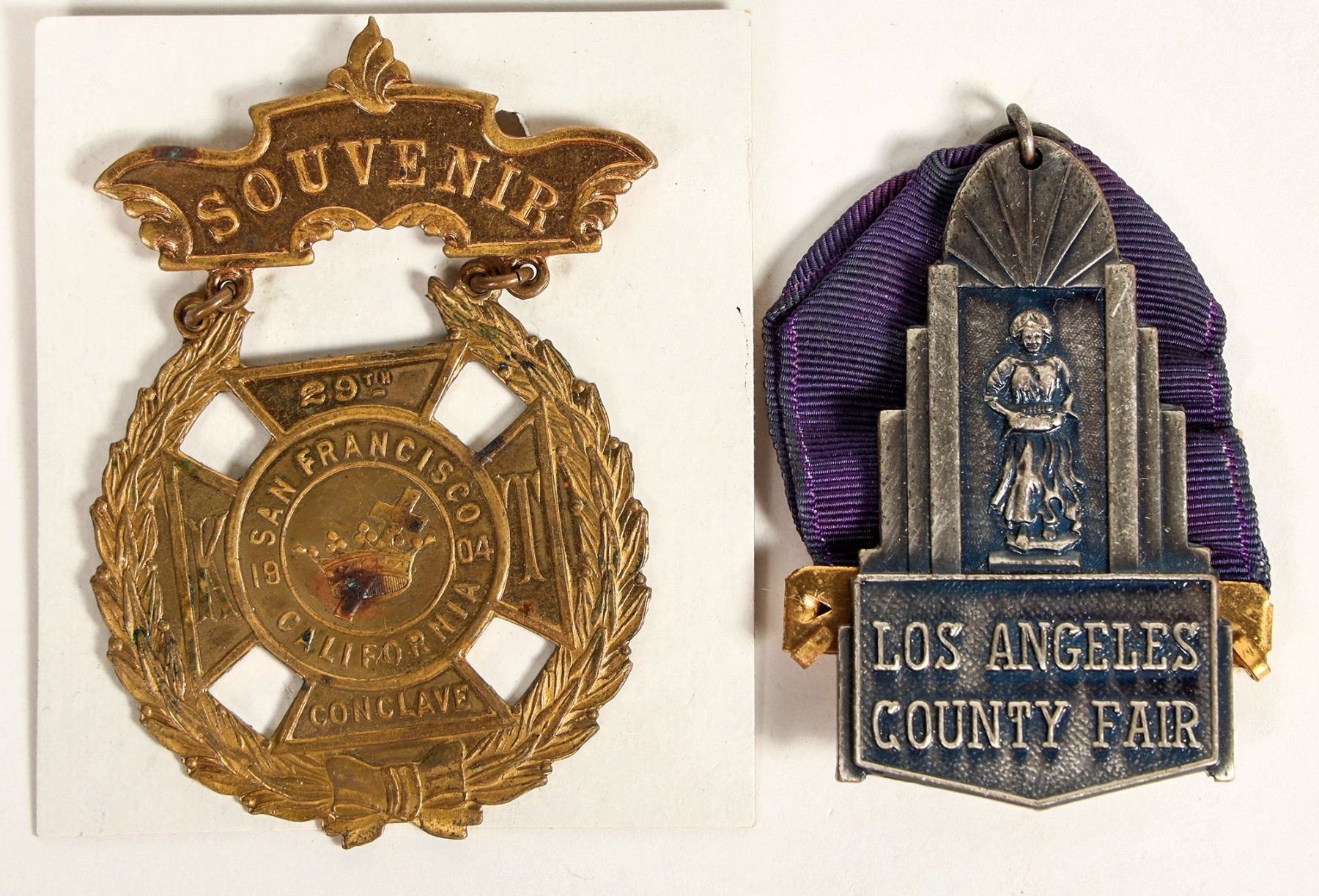 Two pinback badges from California: 1) Los Angeles County Fair with art deco building design; 40 x 50 mm with blue ribbon. 2) 1904 Knights Templar San Francisco conclave; Brass, 40 x 55 mm.