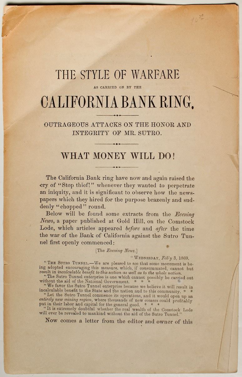 California Banking scandal pamphlet titled, "The Style of Warfare as Carried On By The California Bank Ring. Outrageous Attacks on The Honor and Integrity of Mr. Sutro. What Money Will Do!" 5 pages long with excerpts from newspapers upholding their argument, mainly from 1869. City: State: California Date: 1874 Inventory# 39573