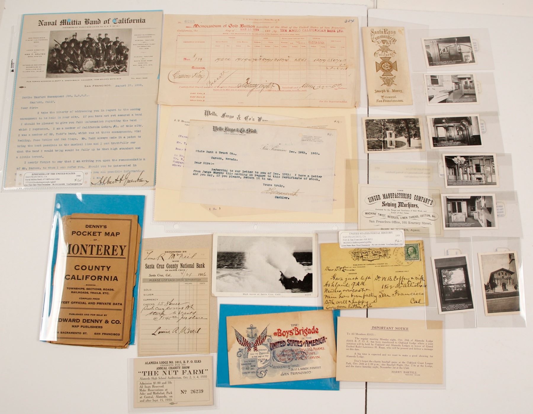 Lot of 22. 1) San Francisco: 1899 memorandum of Gold Bullion deposited at the San Francisco Mint by the Anglo California Bank, gold from the Crown King mine; 1872 advertising card for Singer Sewing Machines; 1909 postcard with Port. & San Francisco RR RPO; 1893 colorful membership card for the Boys' Brigade; two small souvenir photographs (Golden Gate Park and Mission Delores); 1908 pictorial letterhead for the Naval Militia Band of California; and 3 Wells Fargo letterheads from SF to the bank in Carson City, Nevada, 1895-1902. 2) Santa Cruz: 1916 deposit slip for the Santa Cruz County National Bank; and a 1922 postcard showing waves crashing on the shore. 3) San Jose: 6 miniature black-and-white souvenir photographs of the Winchester House, 2 x 3.5" 4) Other: Denny's 1913 Pocket map of Monterey County; Santa Rosa Knights Templar card for the 1883 SF Triennial; and two Alameda BPOE pieces.