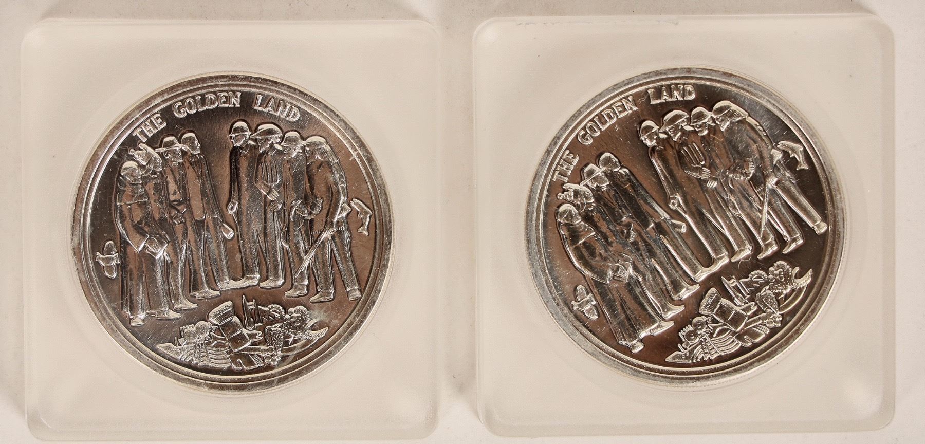 Brilliant uncirculated in hard plastic cases, two 1969 California Bicentennial Medals. Obverse features the grizzly bear; reverse The Golden Land. [ California