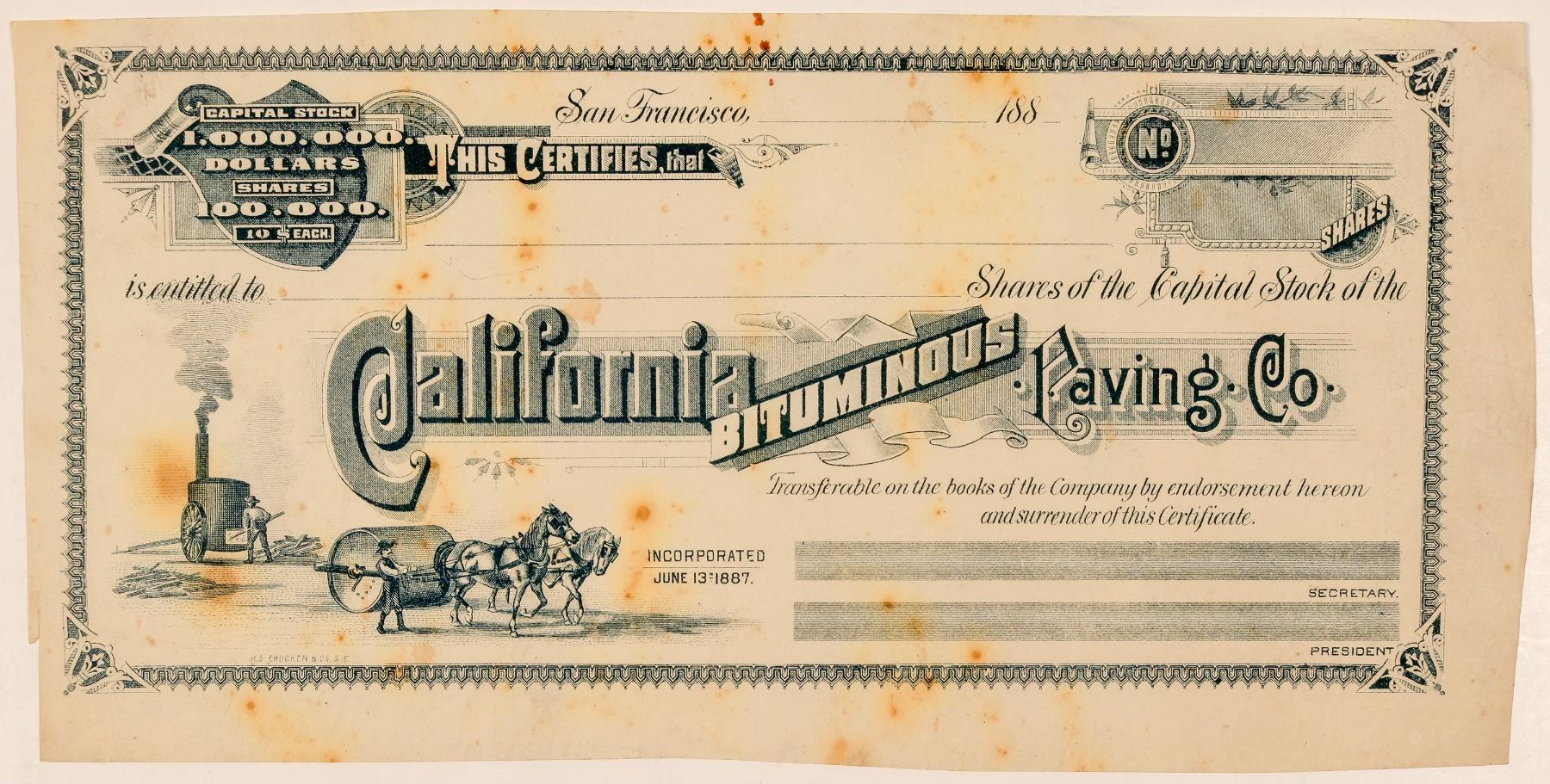 Early asphalt company. Unissued. Dateline San Francisco, 188-. Inc. June 13th, 1887. Ornate logo and vignette of two men with horse-drawn asphalt paving machine. H.S. Crocker. 4.75 x 9.5" Stains and spots. () Ken Prag Collection