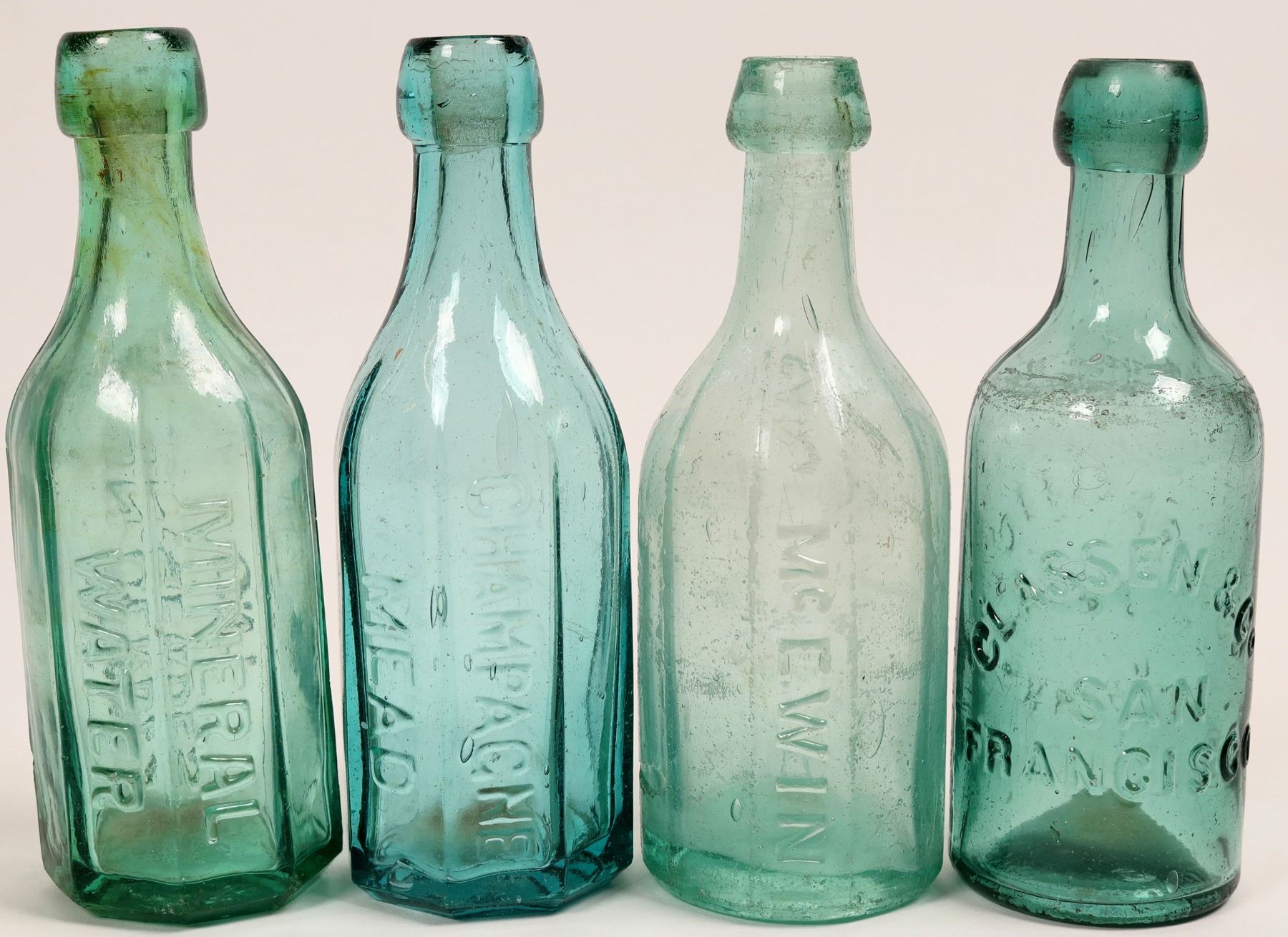 Two octagonal sodas: Gerdes in light lime/aqua; Champagne Mead, aqua; Classen & Co./Pacific Soda Works, aqua; McEwin (10 sided) case wear, stain.