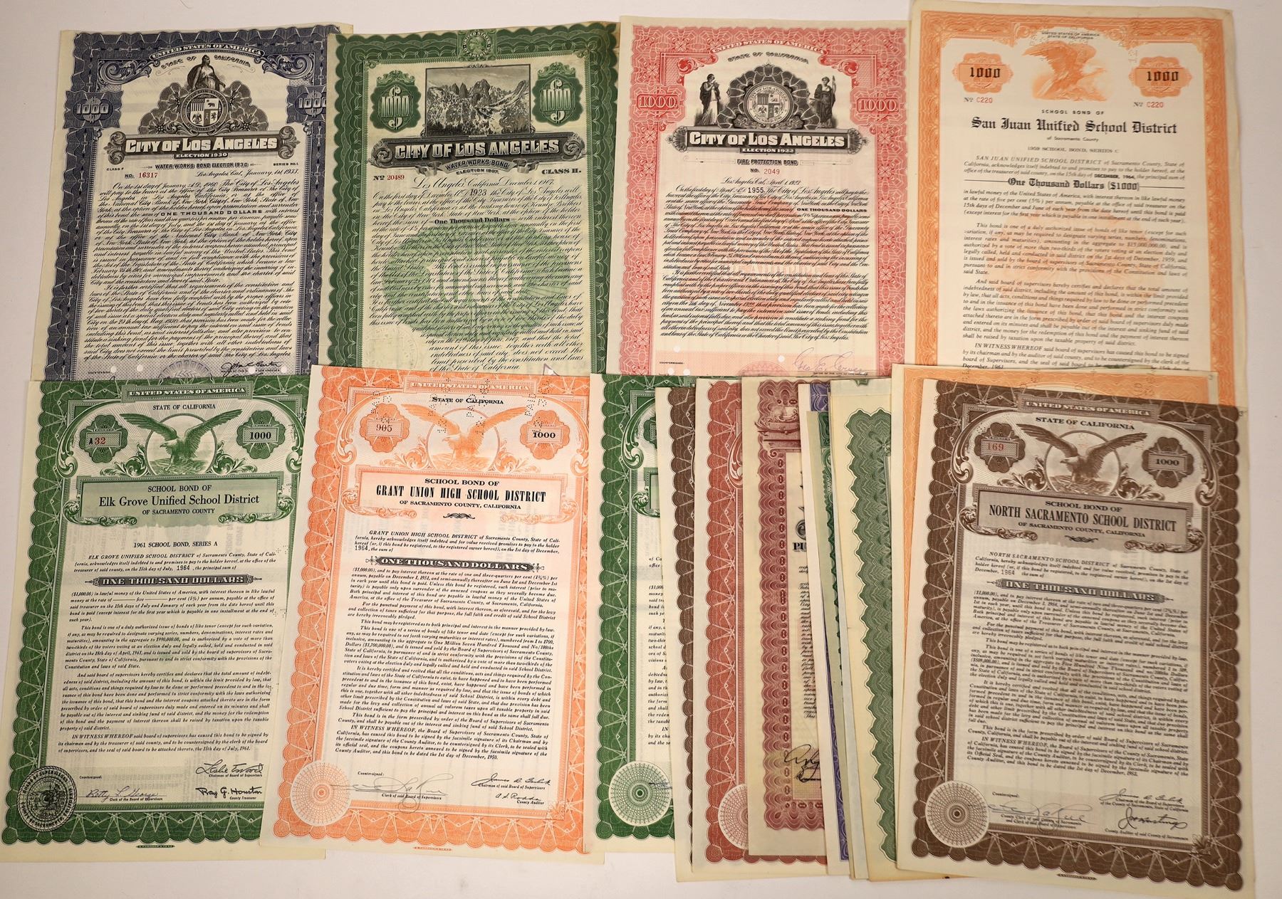 Lot of over 15 bond certificates from California: City of Los Angeles; City and County of San Francisco; San Juan School District and others.
