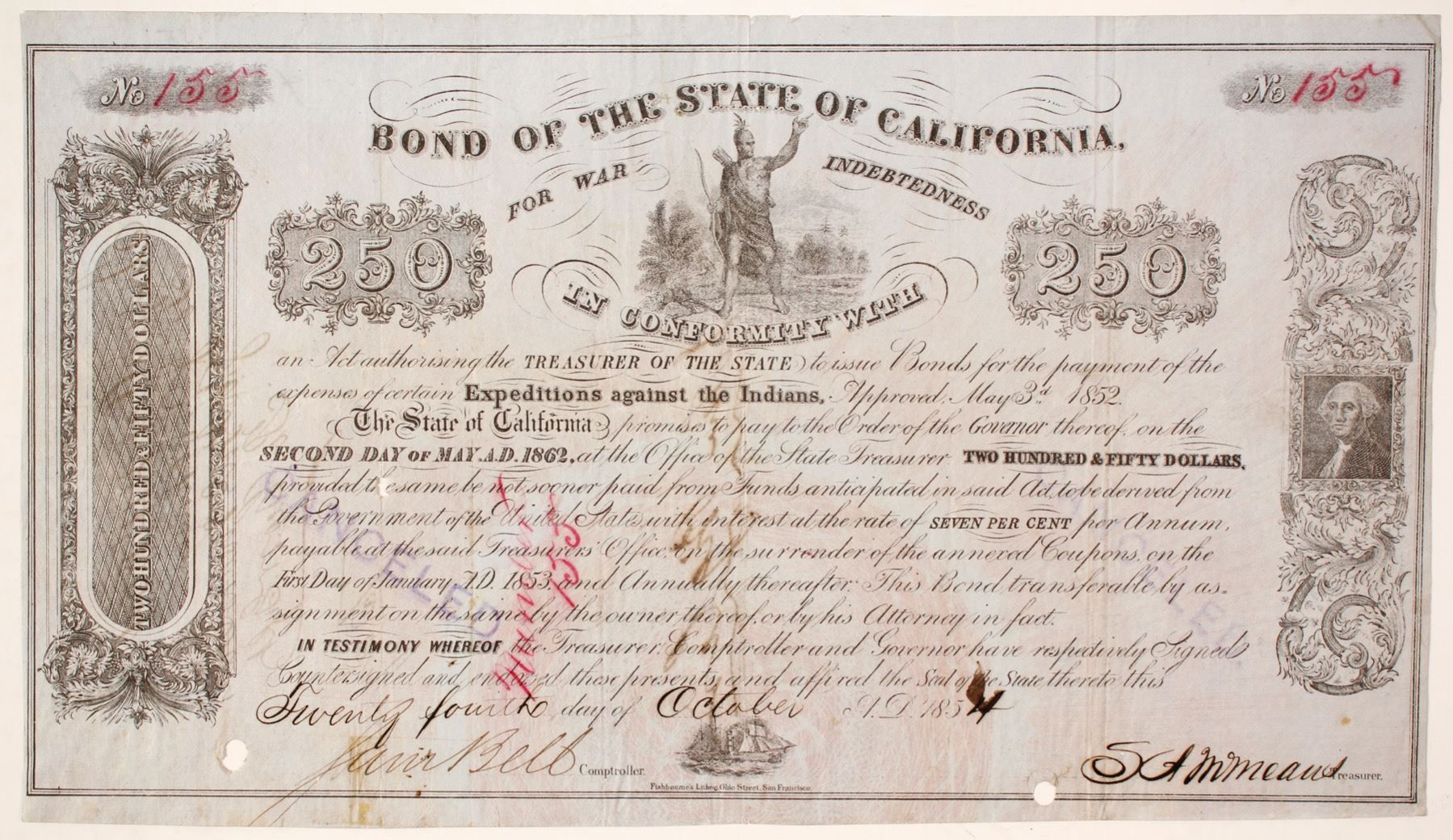 This bond was issued in what is known as the Genocide of the Native American population. Today, many look it as a way for the state to pay for the war against the Native American population which dropped from an estimated 150.000 in 1846 to 30,000 in 1873.Although much of this reduction in population can be attributed to disease which the Native Americans had no defense for, much of it was caused by deliberate and violent attack. [An American Genocide by Madley , introduction by Jinx] Funny three of the four vignettes show Native Americans. State: California City: Date: 1852 HWAC# 85231