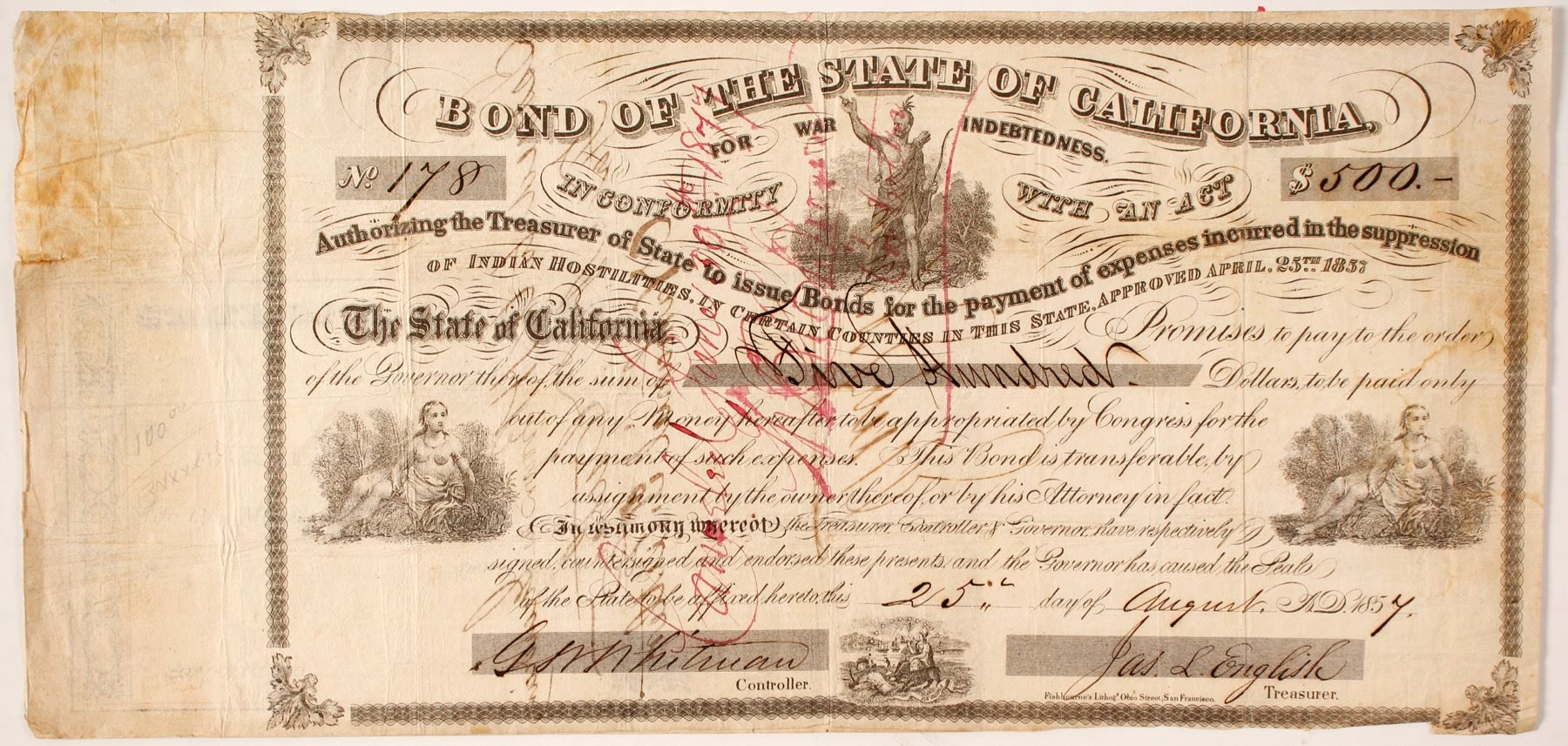 The Indian war this may be attributed to was the Mariposa War. The Mariposa War was a long conflict between Native Americans and miners in California. The war was sparked by the 1849 California Gold Rush. Thousands of hopeful gold seekers crossed this trail into northern California, which at this point in time consisted of mostly Native Americans, and Californios (the descendants of early Spanish settlers). By the end of May 1849, it is estimated that more than 40,000 Whites had entered Indian territory. Anglos soon took control of the gold fields and pushed Californios, as well as Chinese and African American gold seekers from the mines. The gold rush also increased pressure on the Native Americans of California, miners forced Native Americans off their gold-rich lands. Many were pressed into service in the mines; others had their villages raided by the army and volunteer militia. Some Native American tribes fought back, lead raids on settler populations' property in 1850 and 1851. In 1852 the State of California issued these bonds to finance the military expeditions to subdue the Indians. [Wikipedia]