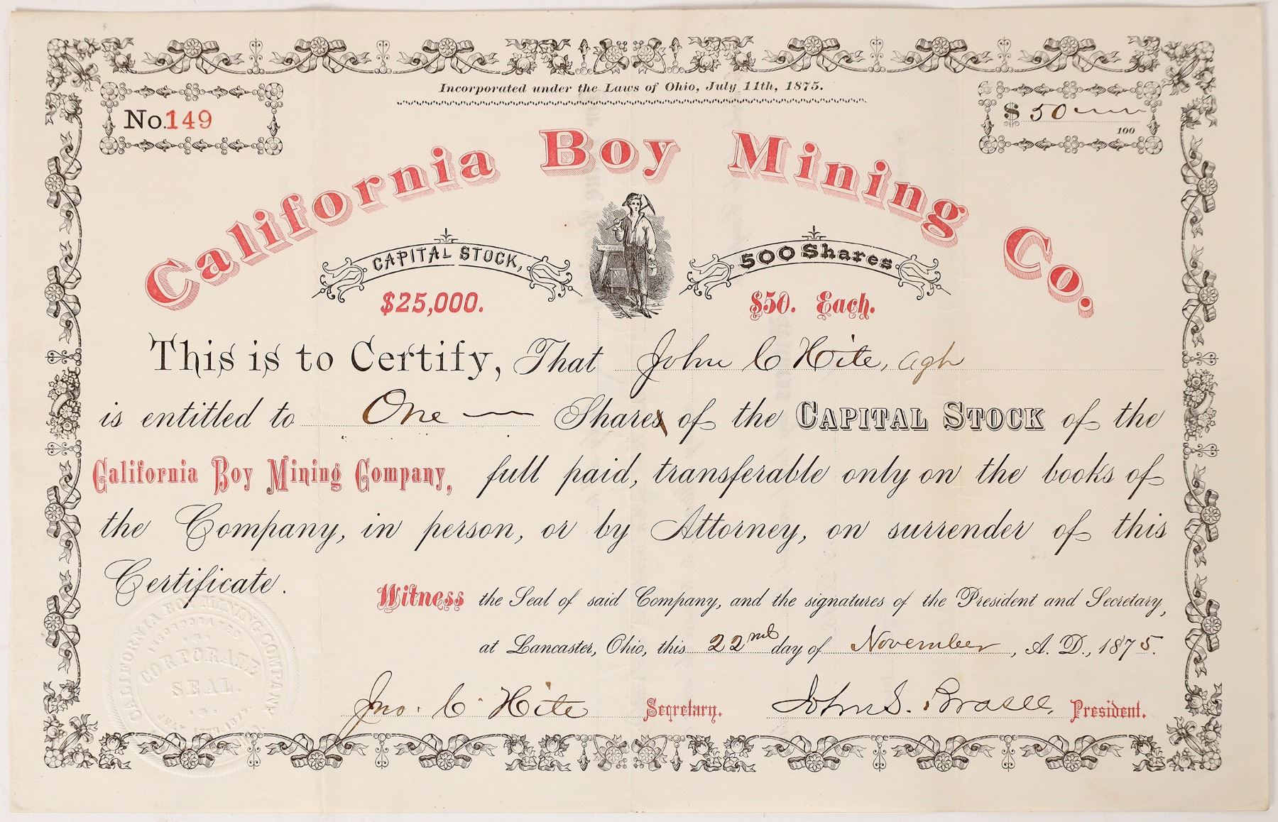 No. 149 for 50 shares to John G. Kite, agh. Dated November 2, 1875. A fun name with an unknown history to this point. Will the mystery of thgis name be solved? United States of America
