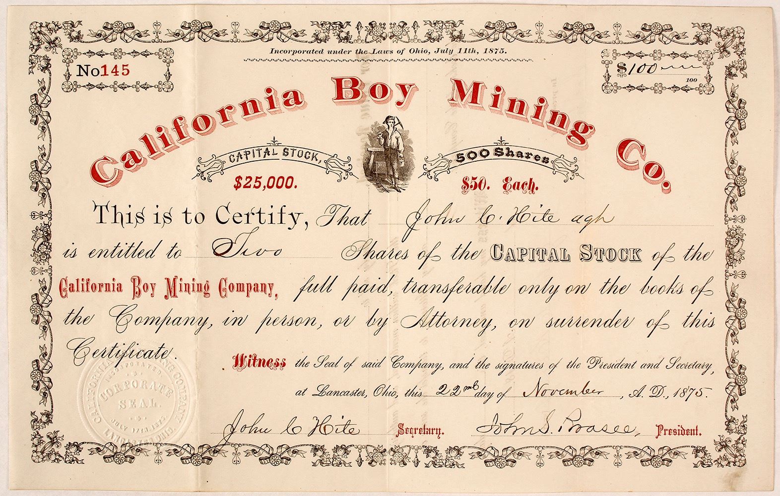 Inc. in Ohio, July 1875. No. 145. Issued for five shares to John Hite, company secretary, on Nov. 22, 1875. Signed by Hite and also John S. Prasee, president. Not cancelled. Small prospector vignette. Red logo. Folds, a few smudges. 7.75 x 12" Information is scarce on this company, but according to Annual Report of Dept. of the Interior, 1876, the company owned the California Boy Mine in the Ophir District, Tooele County, Utah. 1875 Newspaper reports from Tooele County also mention a California Boy, and further pinpoint the mine to Dry Canyon. It shows from four to five feet of ore and vein matter, mostly galena and carbonates. The incline in now in about twenty feet. Owned by Messrs. Pitner, Cromwell, Nagle & Co. (Al Adams Gold Rush Memorabilia Collection) Date: Location: Ophir District, Utah HWAC# 58543