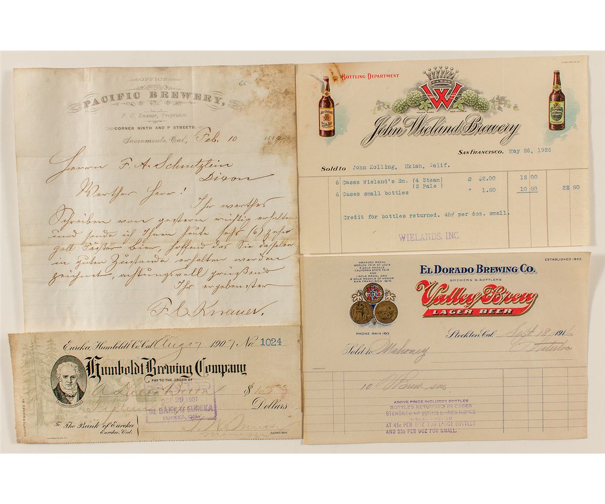 This is a lot of 4 pieces, perfect for any collector looking to add a little bit of California to their collection. 1) Billhead for the John Wieland Brewery. It is dated May 26, 1926. It was a bill for John Kolling of Ukiah for 12 bottles of beer. 2) Check from the Humboldt Brewing Co., Eureka. No 1024 issued on August 17, 1907 for $15. 3) Letter from the Pacific Brewing of Sacramento. It is dated February 10, 1882. 4) Billhead for El Dorado Brewing Co., Valley Brew Lager Beer, of Stockton. It is dated September 18, 1916.City: County: State: CADate: 1882-1926