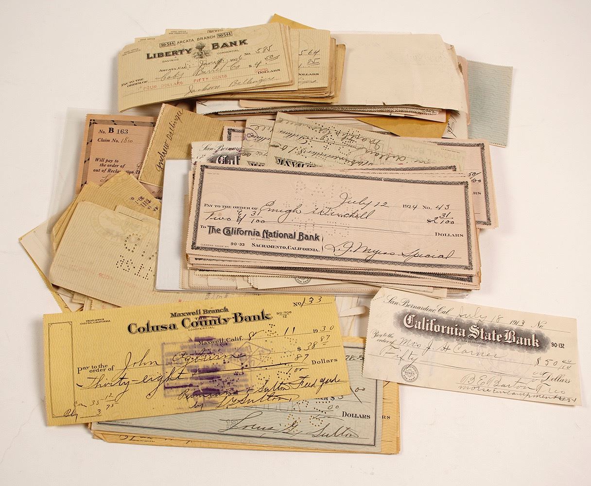 Over 100 old Calif. checks from San Francisco, San Bernardino, Sacramento, Arcata, Randsburg, Jamestown, Hopland and more. Date: c. 1903-1930 Location: California HWAC# 57247