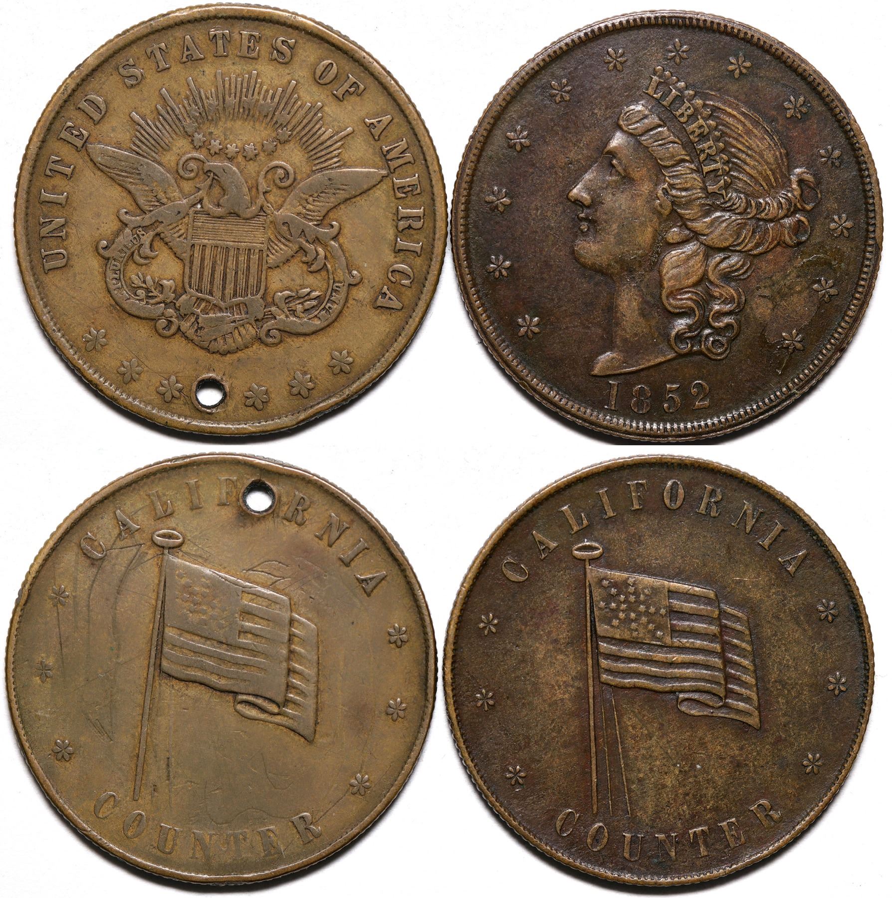 Lot of two. Both have California Counter on the obverse with the American flag. One reverse is the Liberty Head from the $20 gold piece with "1852", the other is the reverse of a $20 gold piece. Bronze, 34 mm, one holed.