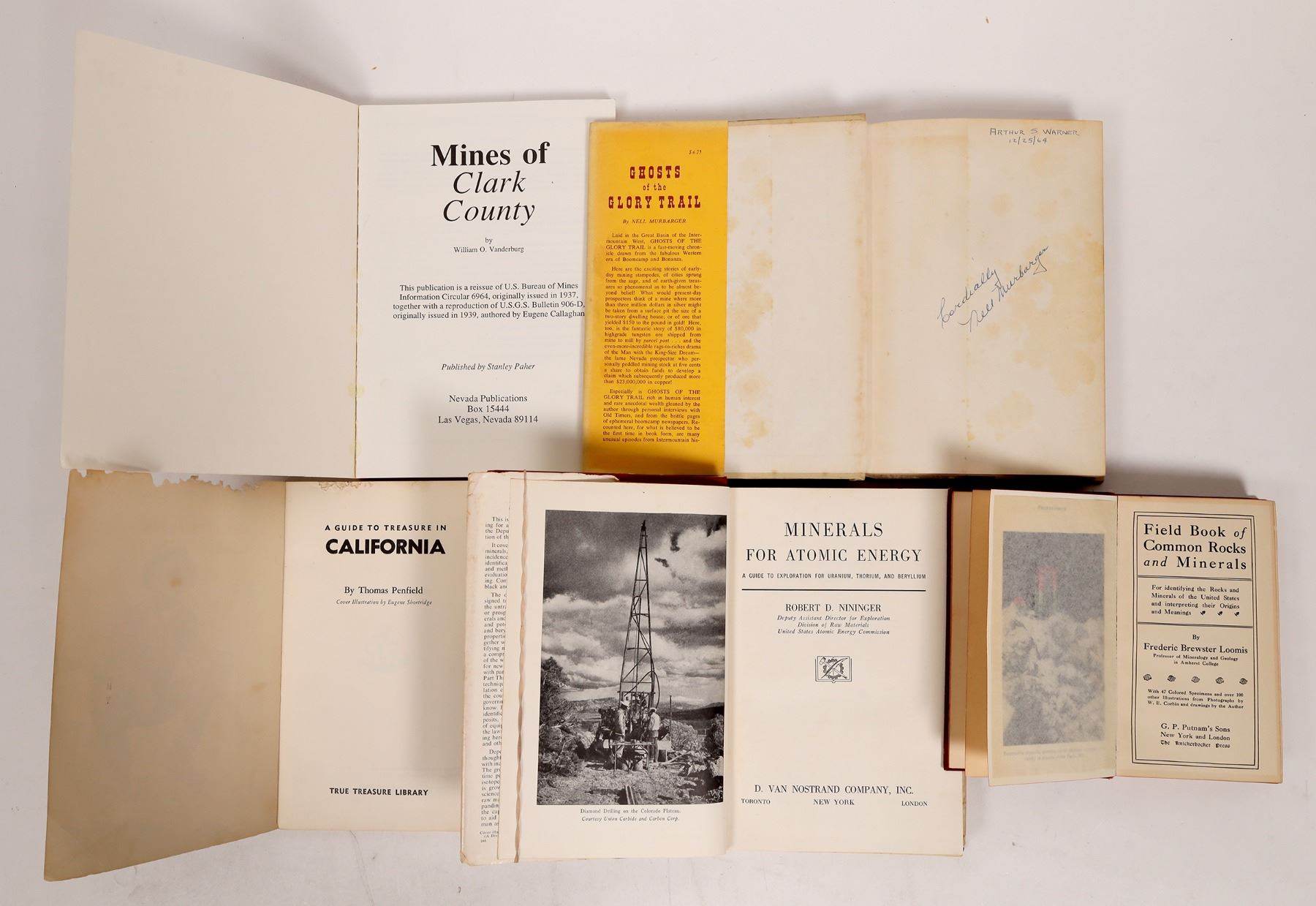 5 California desert and prospecting books. 1925 Field Book of Common Rocks and Minerals by Loomis. Minerals for Atomic Energy by Nininger, Treasure Guide Series California by Penfield, Ghosts of the Glory Trail by Murbarger, Mines of Clark County. California