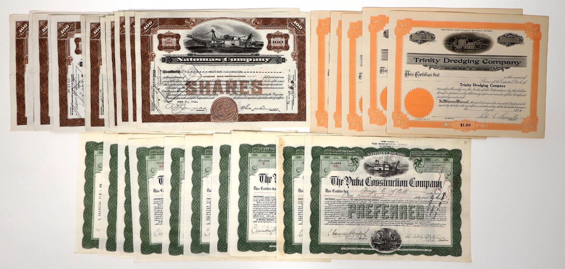 A group of 33 stock certificates three different dredging and construction companies, including the Natomas Company (17) all issued, Trinity Dredging Company (4), with only one issued and The Yuba Construction Company (12) all issued. All in nice condition. Please see photos for more details.