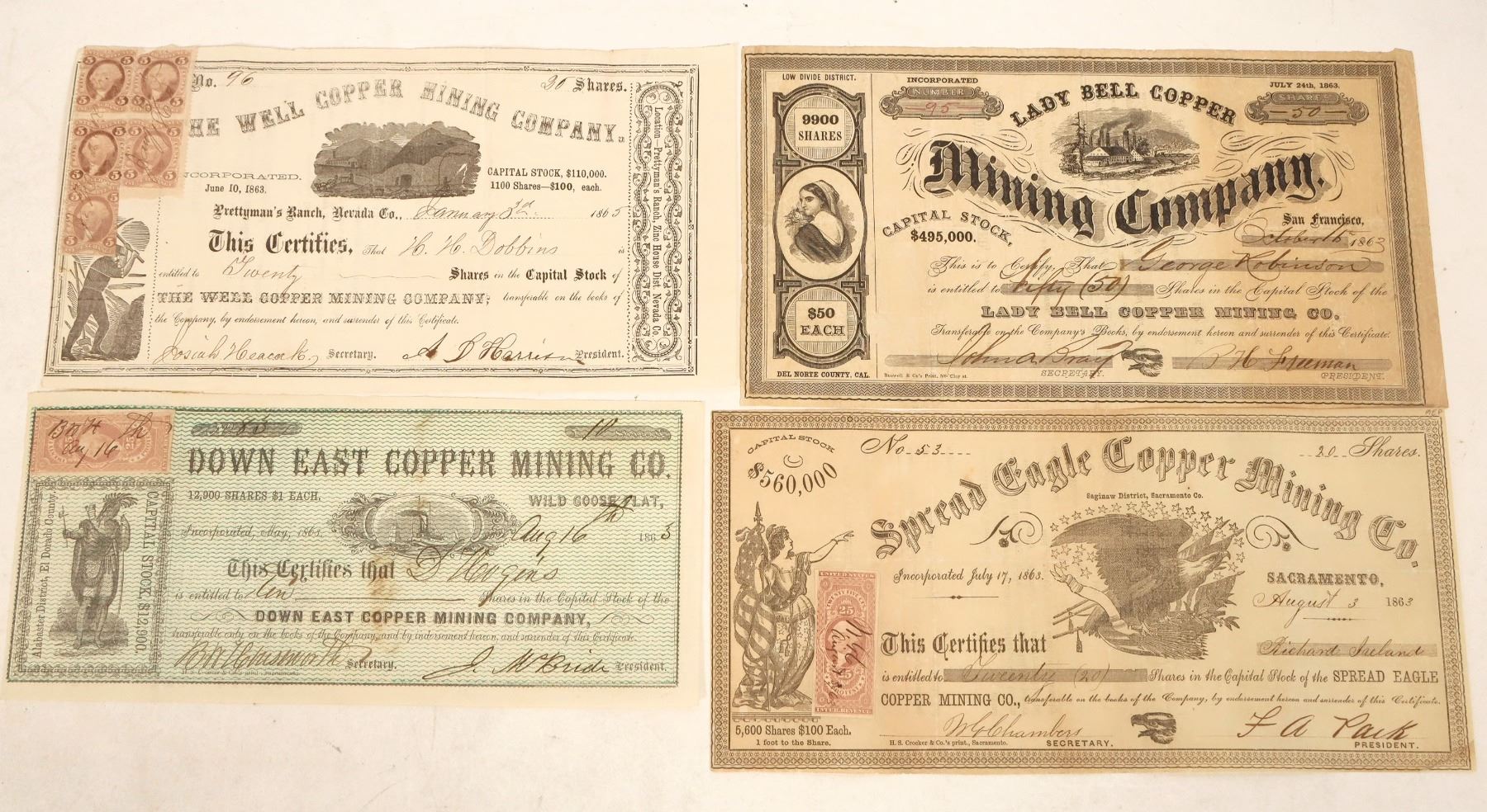 1)1863 Lady Bell Copper Mining with nice vignette. Low Divide District, Del Norte County, Cal. (printed on the top and bottom left). Inc. July 24th, 1863. No. 95, issued for 50 shares to George Robinson on Oct. 15th, 1863 in San Francisco. Signed by president BH Freeman and secretary John A. Bray. Not cancelled. Black border and print. Vignette of woman (left), eagle head (bottom center), and mine (top center). Printed by Buswell & Co. Folds, creases, heavy toning. 5.25 x 9.75" Not in Filer or Holabird indexes. Mentioned in a Daily Alta California Sept. 24, 1864 report of the Del Norte Mines. The author visits the site of the Lady Bell, near the north fork of the Smith River. "This is quite an important location, from the magnitude of the undertaking to open the mine, and the fact that the ground embraces two distinct veins— one 600 feet from the mouth of the tunnel, the other 1,600... Both veins seem reliable. Hence, the first will be cut at 600 feet below the surface; the second at 900."