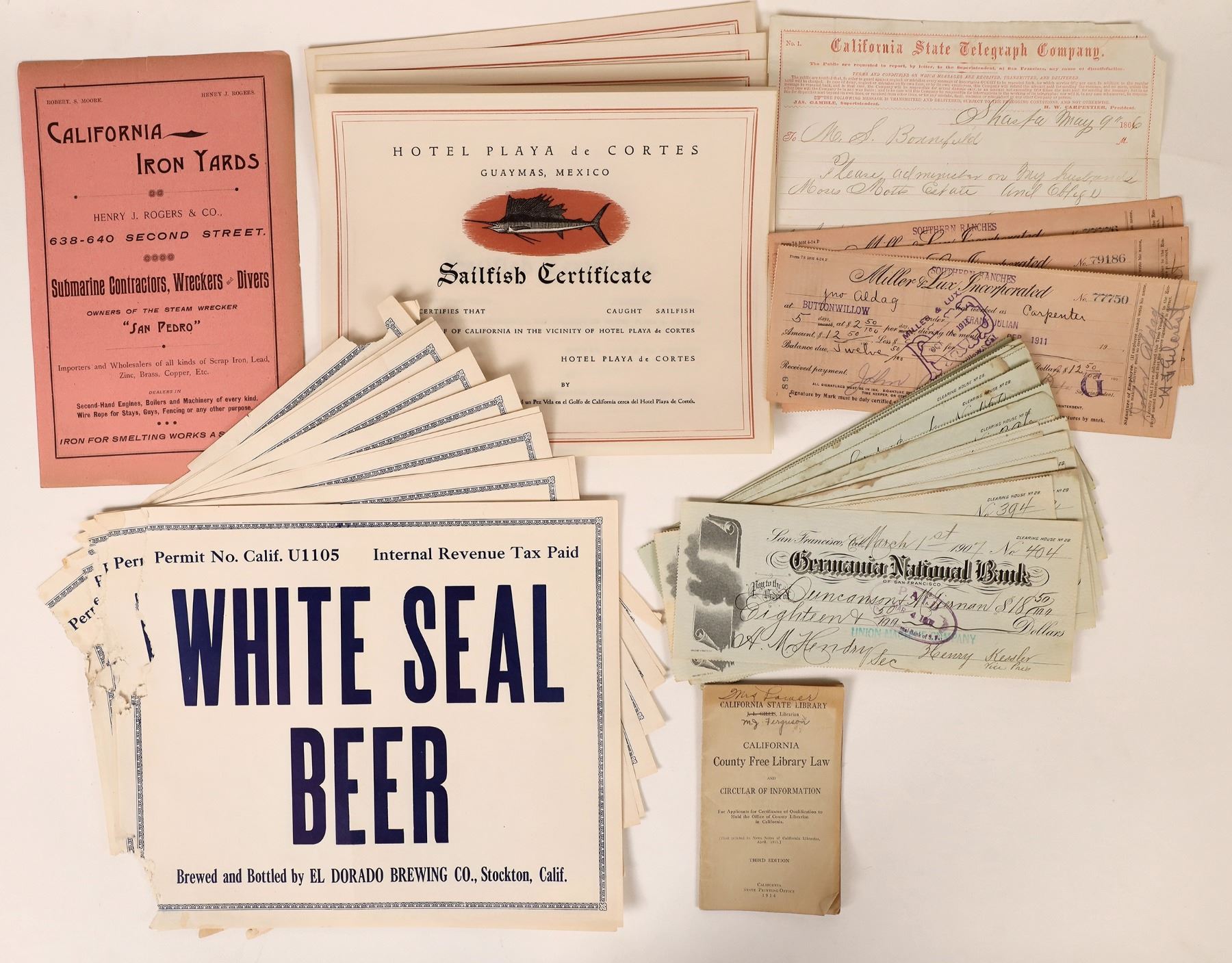 Lot of 45. 1) Twelve labels for White Seal Beer, El Dorado Brewing Co., Stockton. 9 x 10.5" Torn edges. 2) Three paychecks from Miller & Lux, Incorporated (famous ranching company), 1911. 3) California State Telegraph Co. receipt datelined Shasta, 1866. Message is regarding the Moses Mott Estate. 4) 20+ checks from the Union Machine Company, Germania National Bank, San Francisco, 1907-07. 5) Book page advertising California Iron Yards, Submarine Contractors, Wreckers, & Divers, Owners of the Steam Wrecker "San Pedro." 6) Small booklet, California County Free Library Law & Circular Information, 1914. 7) Seven unused Sailfish Certificates from the Hotel Playa de Cortes, Gulf of California.
