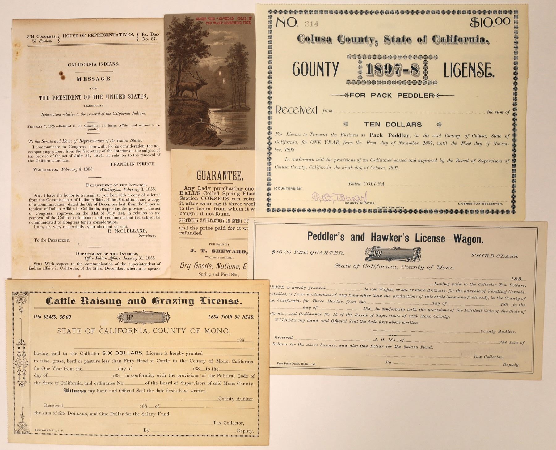 An interesting ephemera collection that consists of a message to the House of Representatives by President Franklin Pierce regarding the California Indians, three license forms for cattle raising and grazing in Mono County, a peddler & hawker license and a Colusa County license blank for a pack peddler (Whatever that is). There is also a store postcard for a merchant in Los Angeles and a tobacconist in San Francisco.