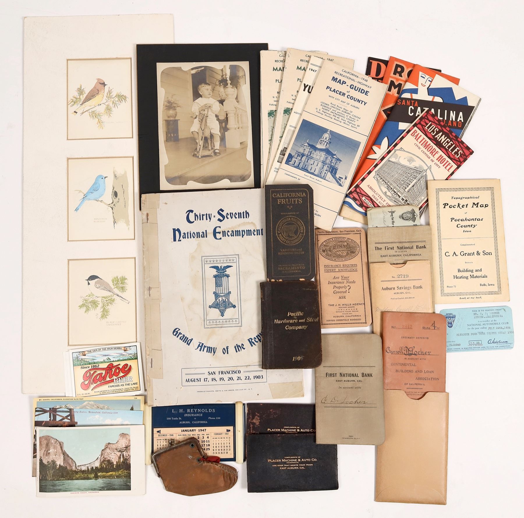 Nice mix of vintage California Ephemera. 1936 Auto Club card, 2x Placer Machine & Auto holder. Pacific Hardware and Steel notebook. 1947 LH Reynolds Auburn calendar-3x5". Bakersfield and Mt. Shasta postcards. Aetna Insurance notebook. 1926 California Fruits. Maps-Los Angeles, Santa Catalina Island, 1947-48 Placer and Yuba counties, PCH. 25 unused Tahoe Beer labels. 1903 GAR National Encampment program-taped spine. 3 Auburn bank books, 1 from San Francisco.