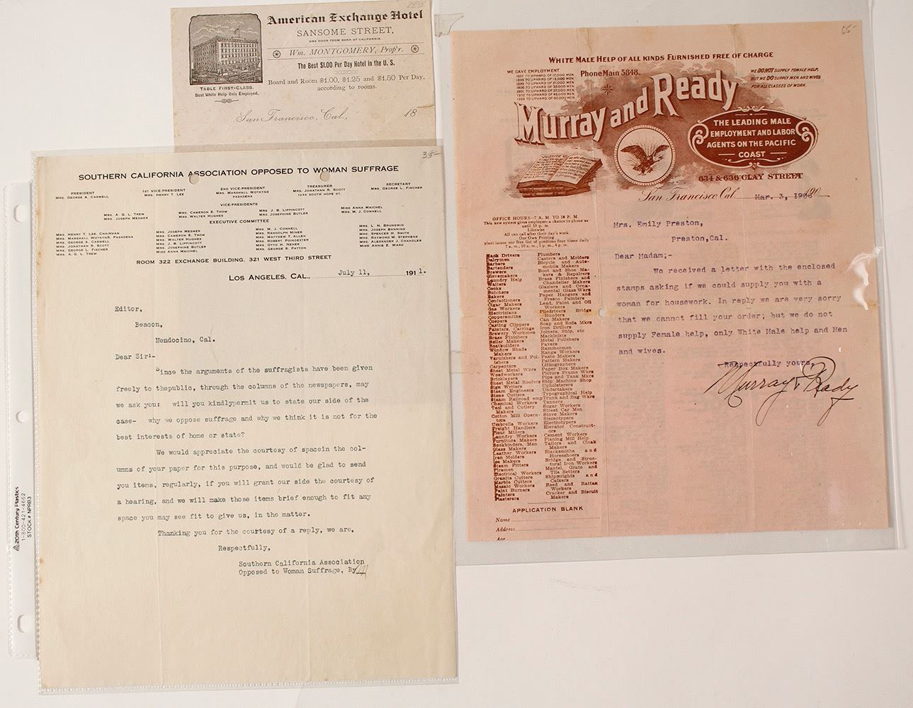Lot of three letterheads that reveal prejudice toward African Americans & women in the workplace. 1) Unused pictorial 19th century letterhead for the American Exchange Hotel in San Francisco that boasts "Best White Help Only Employed." 2) Pictorial letterhead for Murray & Ready, The Leading Male Employment & Labor Agents on the Pacific Coast, San Francisco. Message is dated March 3, 1906 (month before SF earthquake) and is addressed to Emily Preston in Preston, CA: "We received a letter...asking if we could supply you with a woman for housework...we cannot fill your order...we do not supply Female help, only White Male help and Men and wives." 3) 1911 letter from the Southern California Association Opposed to Woman Suffrage, Los Angeles. To the Editor of the Beacon in Mendocino: "Since the arguments of the suffragists have been given freely to the public...may we ask you...to state our side of the case." (Prag Collection) Date: 1906 & 1911 Location: California HWAC# 55419