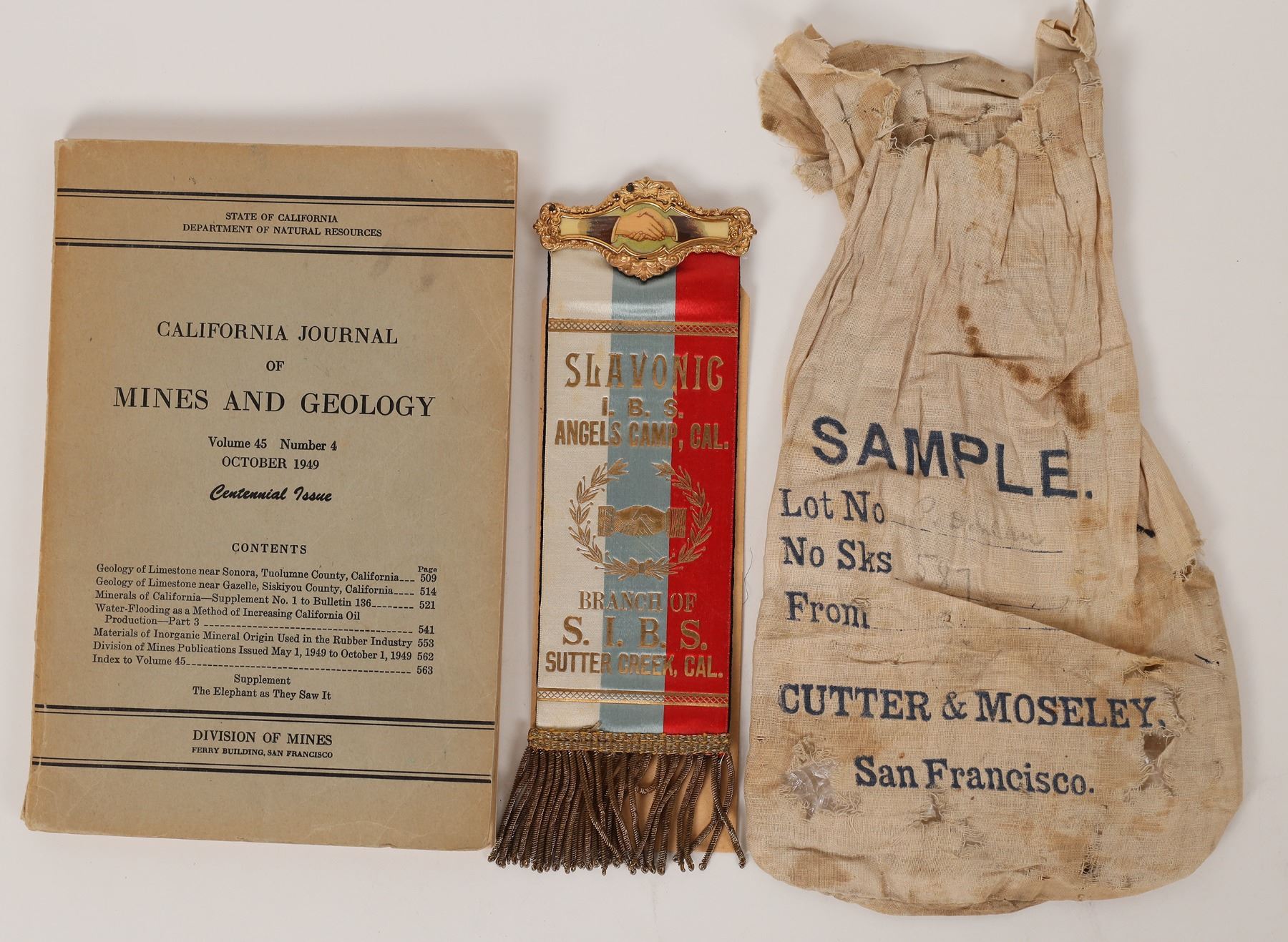Slavonic Angels Camp Ribbon. Cutter & Moseley grain? sample sack, 10x6". California Journal of Mines and Geology 1949. California