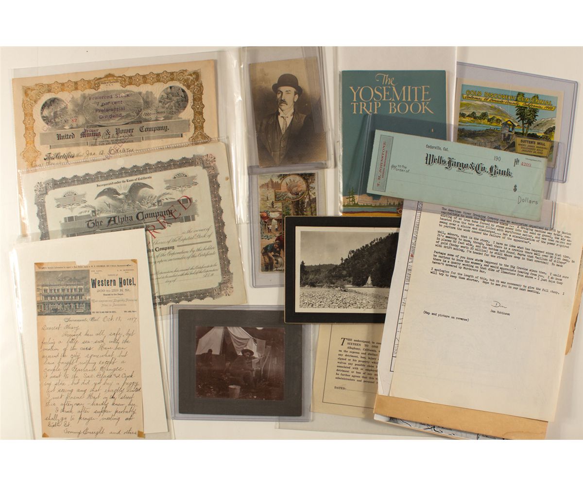 1) Yosemite Trip Book by F.J. Taylor. Published by H.S. Crocker Co. in 1927. 61 pages including many great black and white photographs. 2) Stock certificate for United Water (Mining crossed out) & Power Co. Issued in 1907 and stamp cancelled. 3) Very nice pictorial trade card for Arbuckle Bros. Coffee, with vignettes celebrating California history. 4) Unused early color postcard. Steamer Tahoe at Emerald Bay, Lake Tahoe, California. 5) Unused 190_ WF check for T.H. Johnstone, General Merchandise in Cedarville, Cal. 6) Letter dated 1887 written on pictorial Western Hotel (Sacramento) letterhead. 7) Photo postcard stamped on reverse "Office Chief of Police, San Francisco, Dec 20, 1918." 8) Unused form to allow someone to enter or inspect the mine and mill of the Original Sixteen to One Mine, Inc. in Alleghany, California. 193_. 9) 4.5." x 4.5" cabinet sepia photo of miners sitting next to canvas tent. 10) Cabinet card 5.5" x 4.5" showing metal bridge. 11) Unissued stock certificate for The Alpha Company. 19__. Eagle vignette. 12) 1948 card with stamp celebrating centennial of gold discovery at Coloma. 13) A folder containing modern copies of maps and documents related to mining and California gold history.