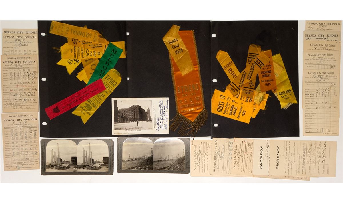 Lot of 40 items, most from Southern California. Includes: 20 ribbons, most for Native Sons of the Golden West (Athens Lodge) events in the Bay Area (1909-1925); a mailed 1908 postcard showing the ruins of the Palace Hotel in SF after the earthquake; 17 report cards/promotion cards for Nevada City Schools (c.1908-1920); and two Keystone Co. oil industry stereoviews.