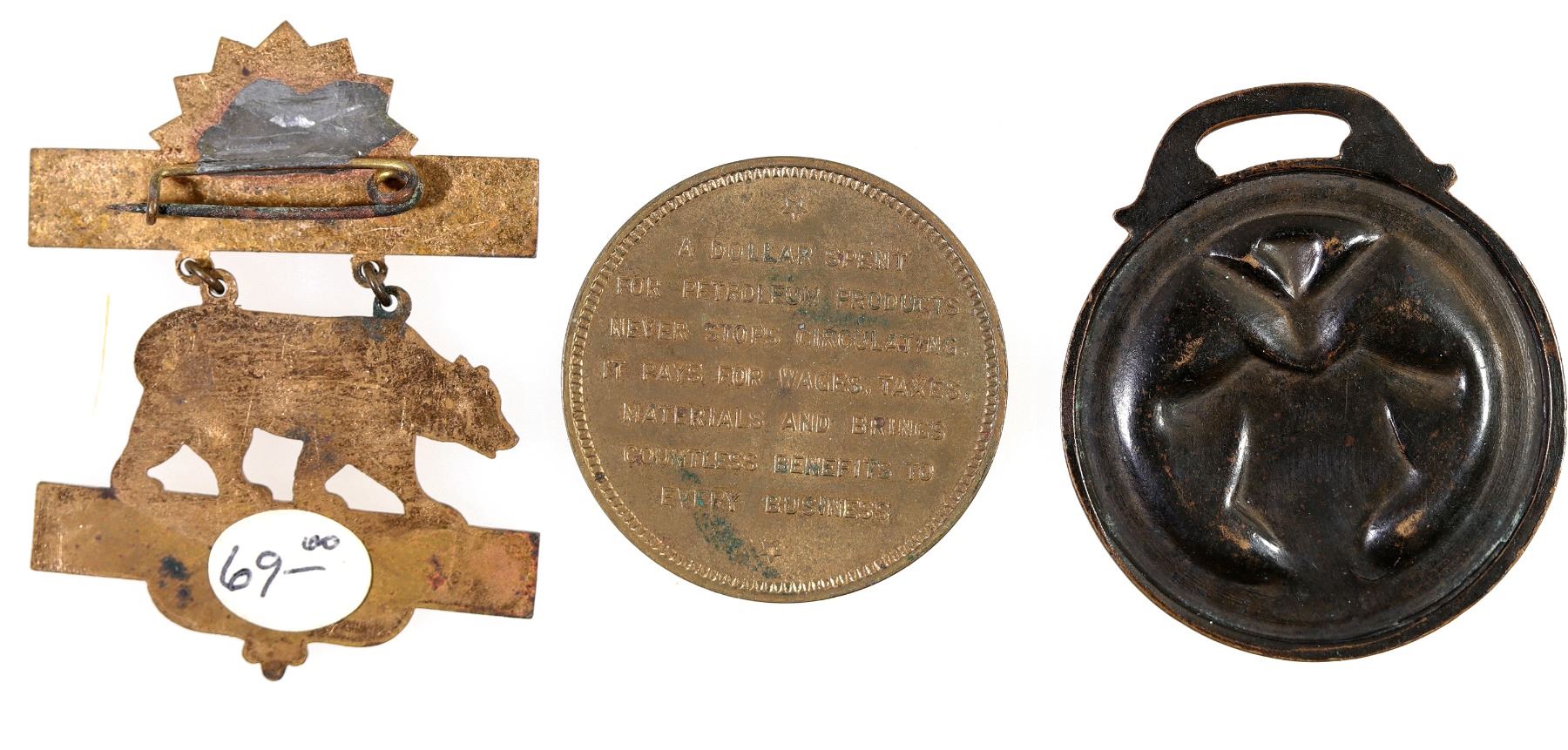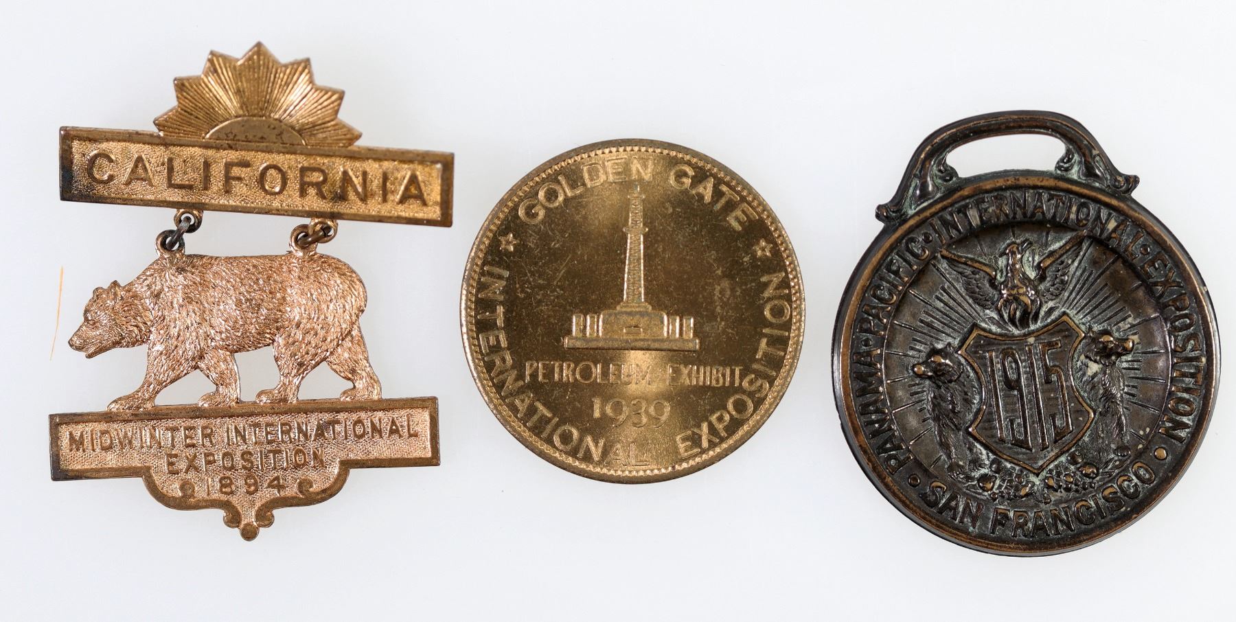 Lot of three: brass badge with grizzly bear from the Midwinter International Exposition of 1894; watch fob from the 1915 Pan Pacific Exposition; 1939 Golden Gate Expo petroleum medal.
