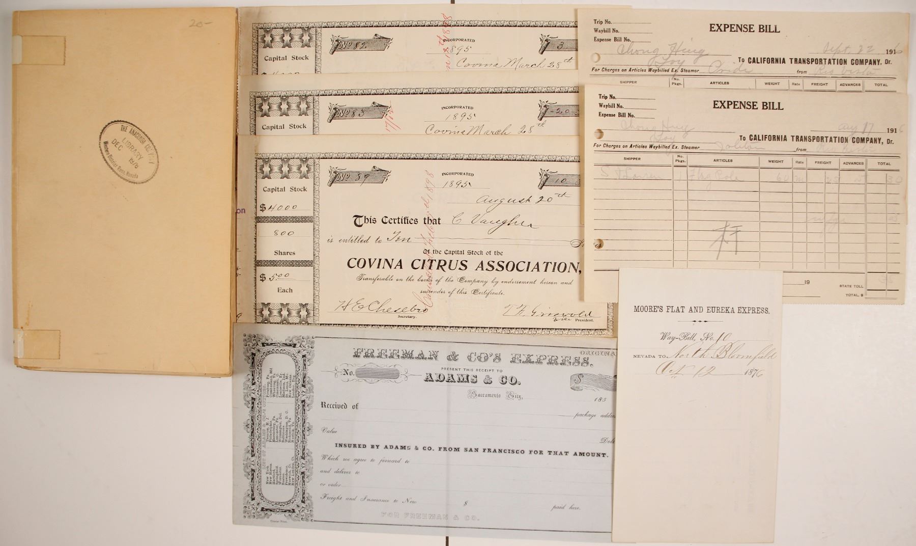 Lot of 8. 1) Unissued 1850s receipt for Freeman & Co's Express / Adams & Co. Dateline Sacramento City, 185_. Has list of Adams & Co. offices on the lefthand side. Rare Gold Rush era receipt between express companies. 5.25 x 10.5"Some toning. 2) Two expense bills for the California Transportation Company for transport of material on steamers from Rio Vista. 1916. Consignee is Chinese. 3) Way-bill for Moore's Flat & Eureka Express, Nevada City to North Bloomfield, Oct. 12, 1876. Excellent condition. 4) Three 1896 issued stock certificates for the Covina Citrus Association. 5) Guidebook of the Western United States. Part D. The Shasta Route and Coastline. 140pp. with numerous color maps. c.1915 Condition issues including missing covers, chipping pages, and taped spine.