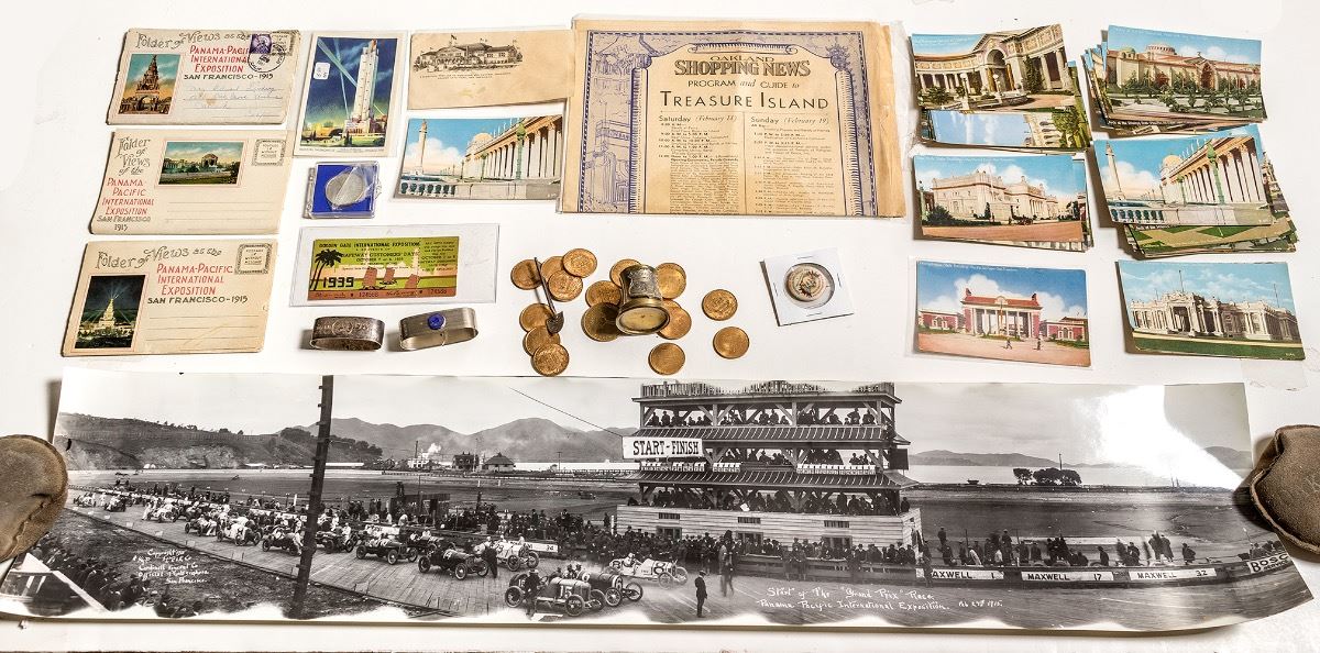 A group of California fair and exposition collectibles that includes a panorama of a car race from the Panama Pacific International Expo c. 1915, program and guide to Treasure Island, shot glass, 37 postcards, 3 folder views for the Panama-Pacific International Expo c.1915, 17 Panama Expo gold medal beer tokens c. 1915, Sacramento Street Fair pin with clown picture c. 1900, Midwinter Expo shovel pin c. 1894, 2 slides, and a San Diego 200 year commemorative token. City: State: California, Date: Inventory# 38556