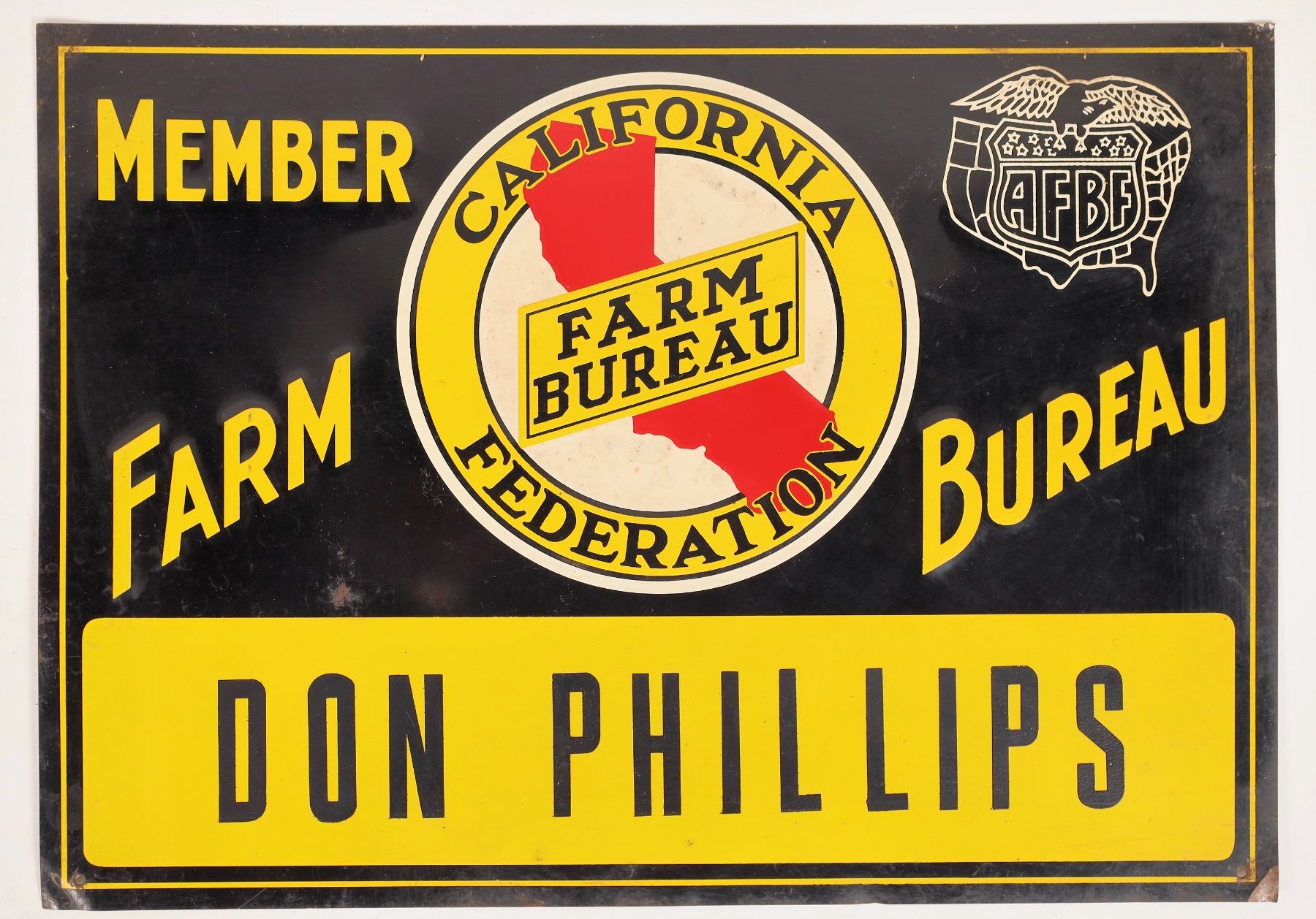 Nice yellow, red, white and black California Farm Bureau metal sign for Don Phillips. 10x14", a little wear on corners.
