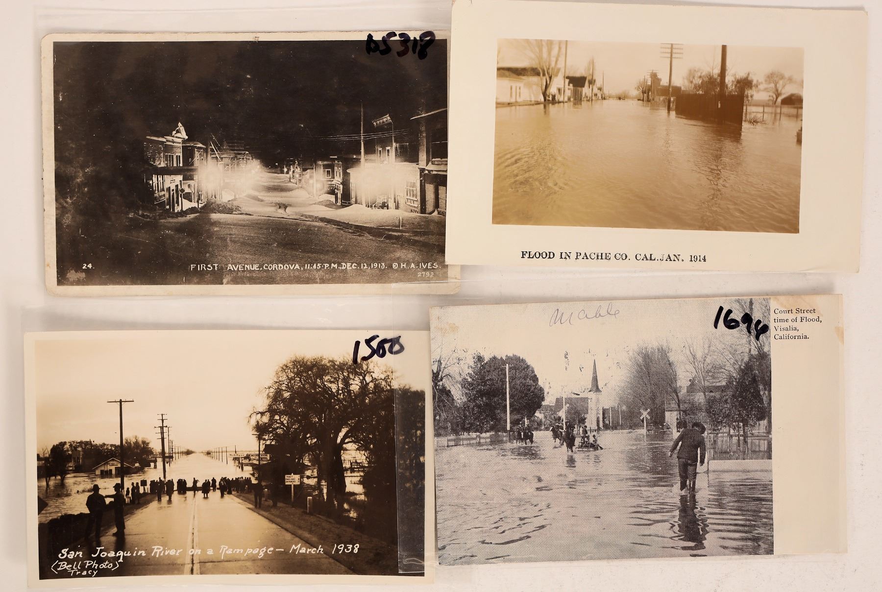A group of 4 postcards with photos of floods in California, c1907-38. Includes 3 RPCs, 1 other, with 2 canceled, 2 unused. The 4 include: 1906 flood in Visalia, Ca.; "FLOOD IN PACHE CO. CAL. JAN. 1914," postmark Concord, Ca.; "FIRST AVENUE, CORDOVA, 11:45 P.M., DEC. 12, 1913. c H.A. IVES."; "San Joaquin River on a Rampage - March 1938 (Bell Photo) Tracy." [California]